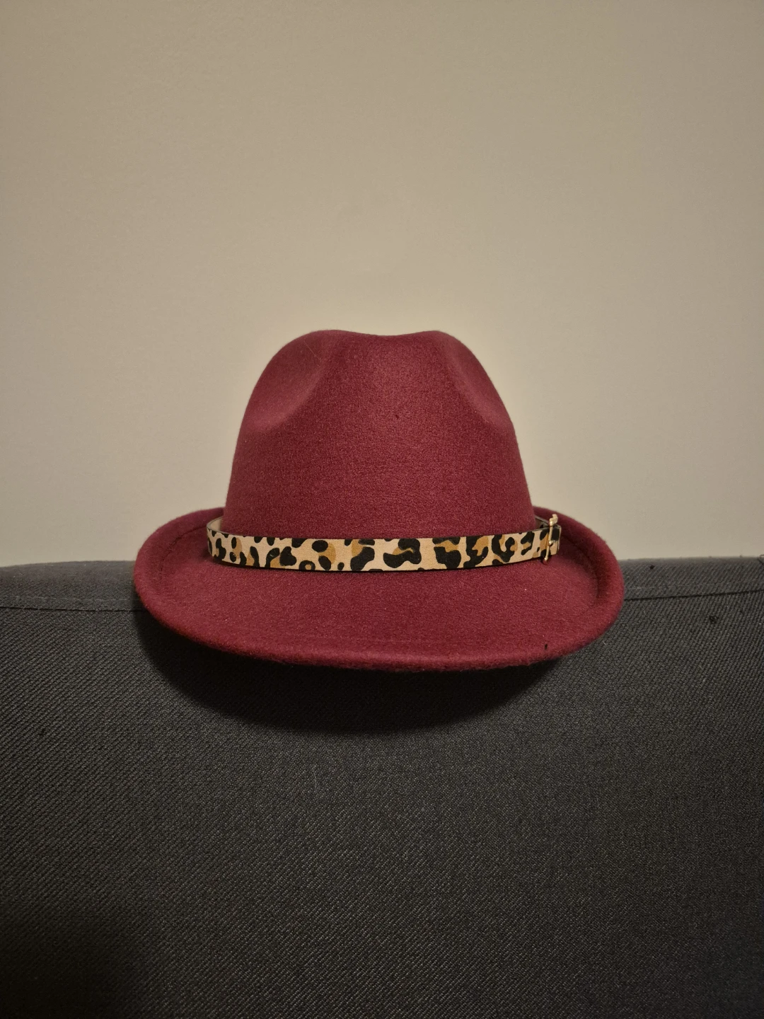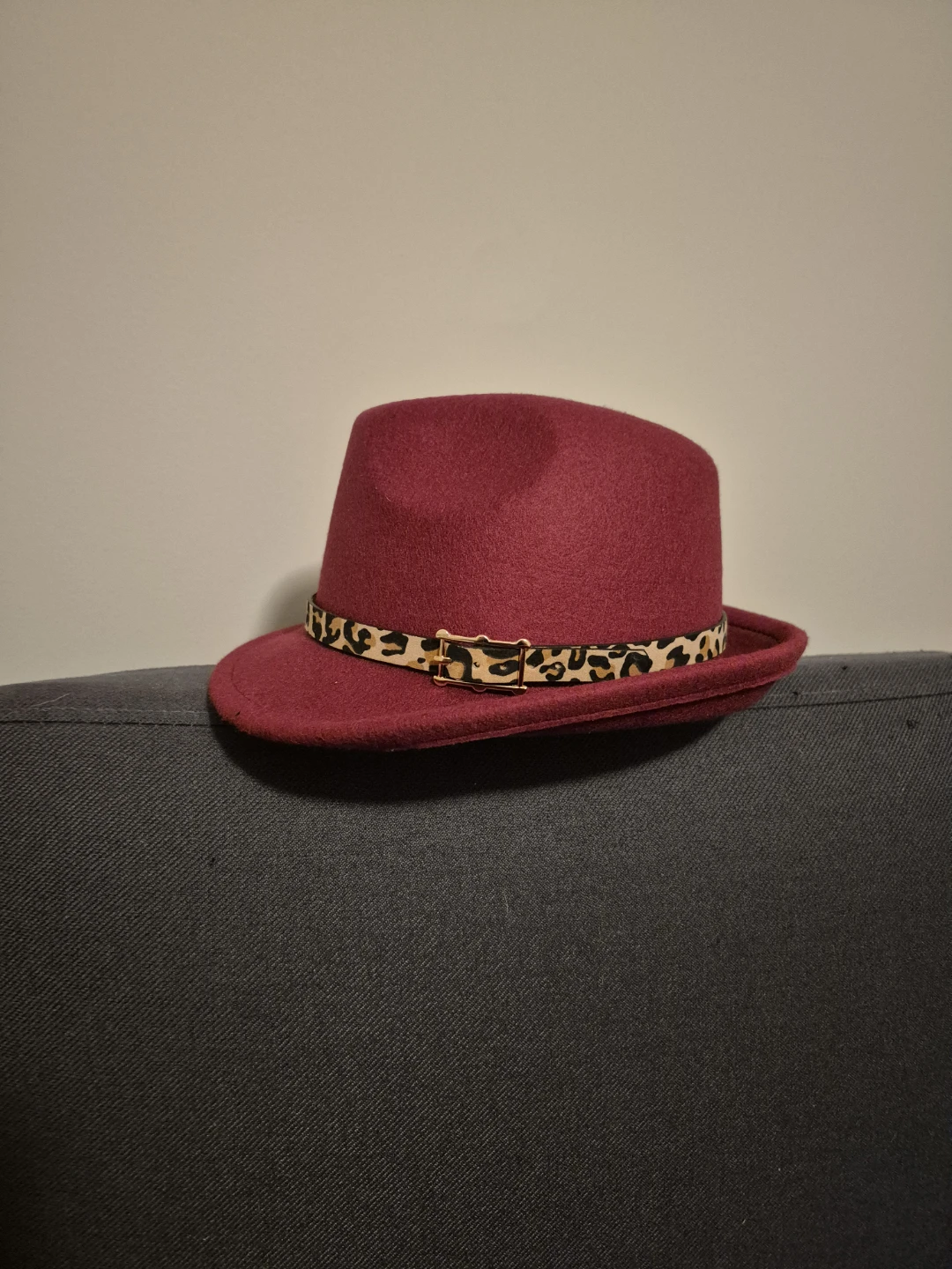 A stylish maroon fedora hat is adorned with a chic leopard print band. It's crafted from felt material for a classic look. This hat adds a touch of flair to any outfit!