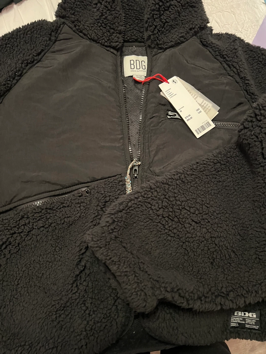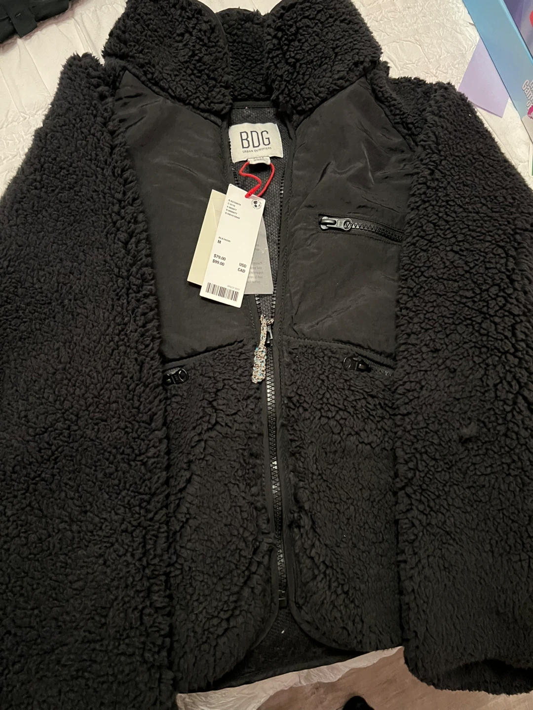 Cozy up in this BDG Urban Outfitters black fleece jacket! It's a size medium and features a stylish design with a mix of fleece and smooth fabric panels. The tag shows it originally retailed for $99 CAD. Perfect for adding a touch of warmth and style to your wardrobe!