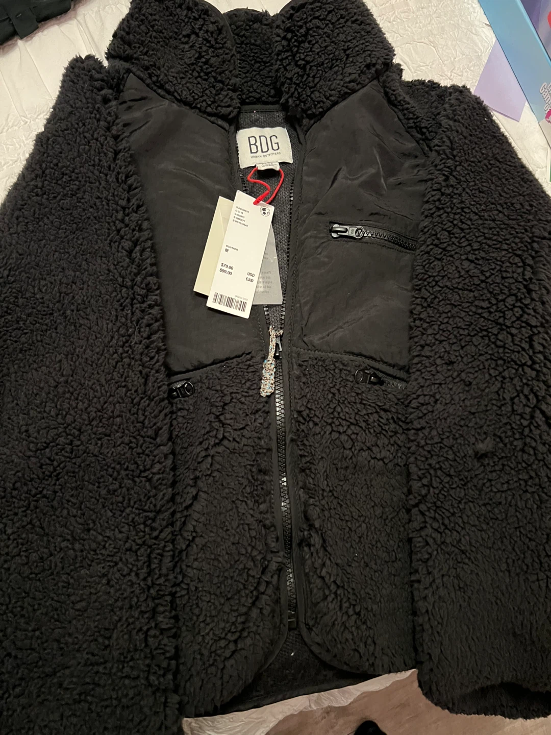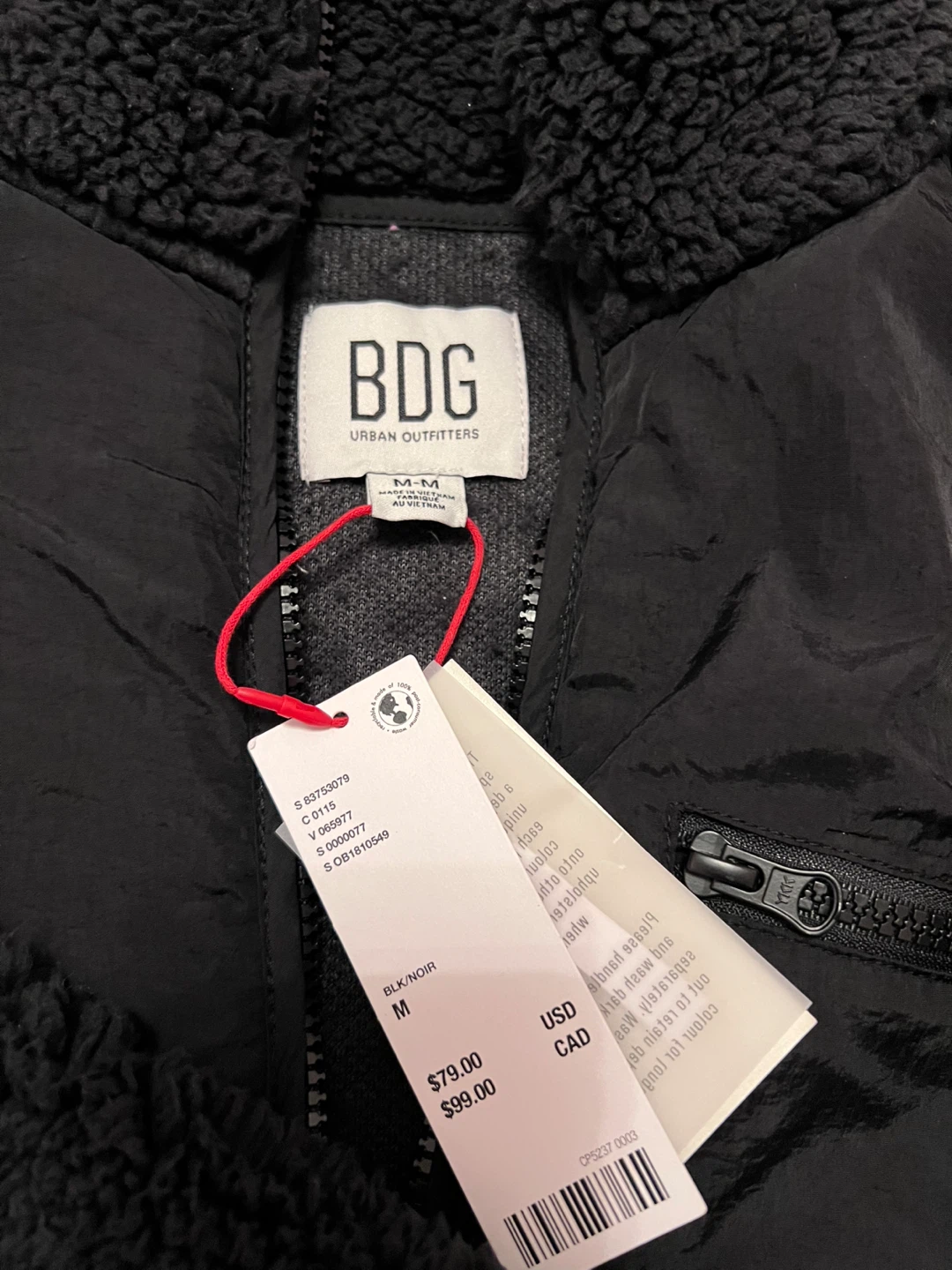 Cozy up in this BDG Urban Outfitters black fleece jacket! It's a size medium and features a stylish design with a mix of fleece and smooth fabric panels. The tag shows it originally retailed for $99 CAD. Perfect for adding a touch of warmth and style to your wardrobe!