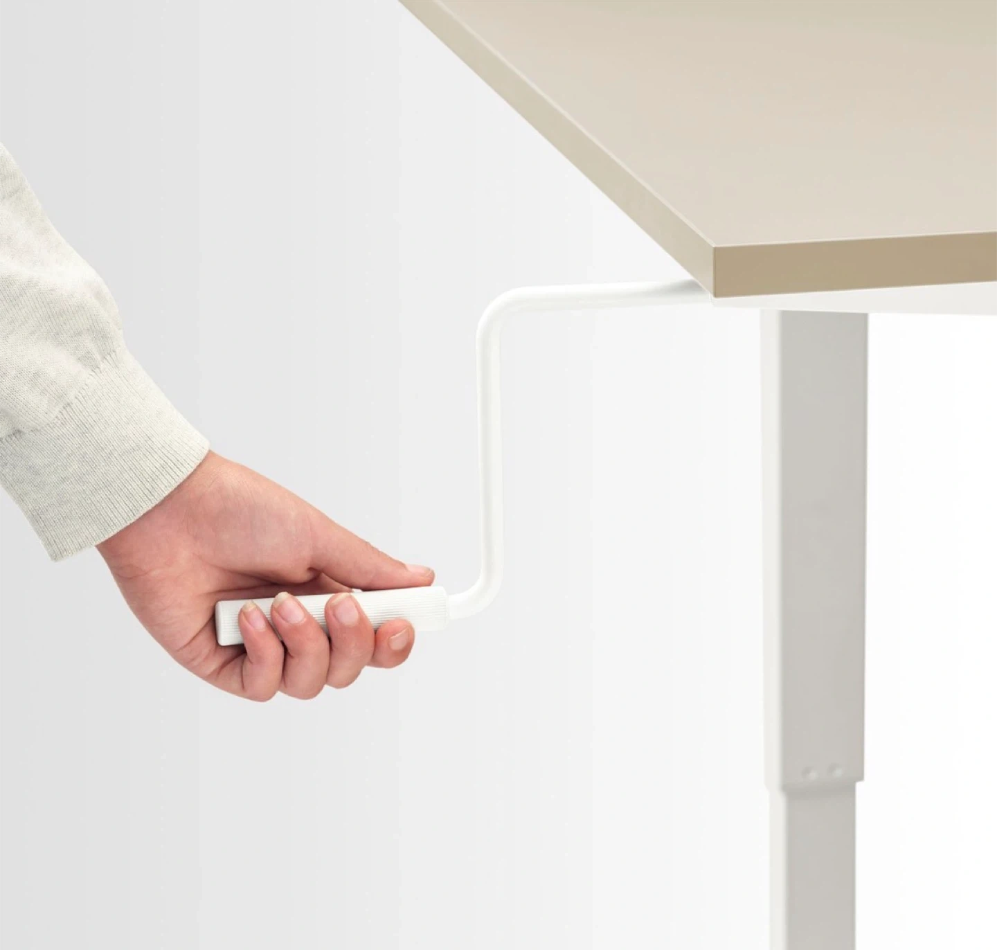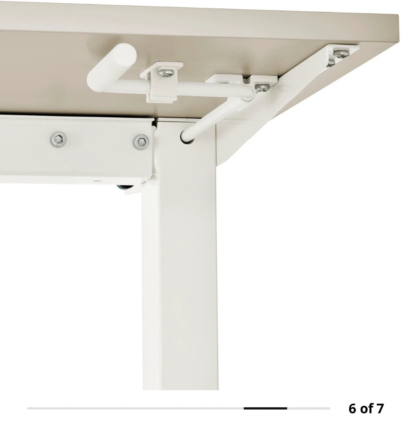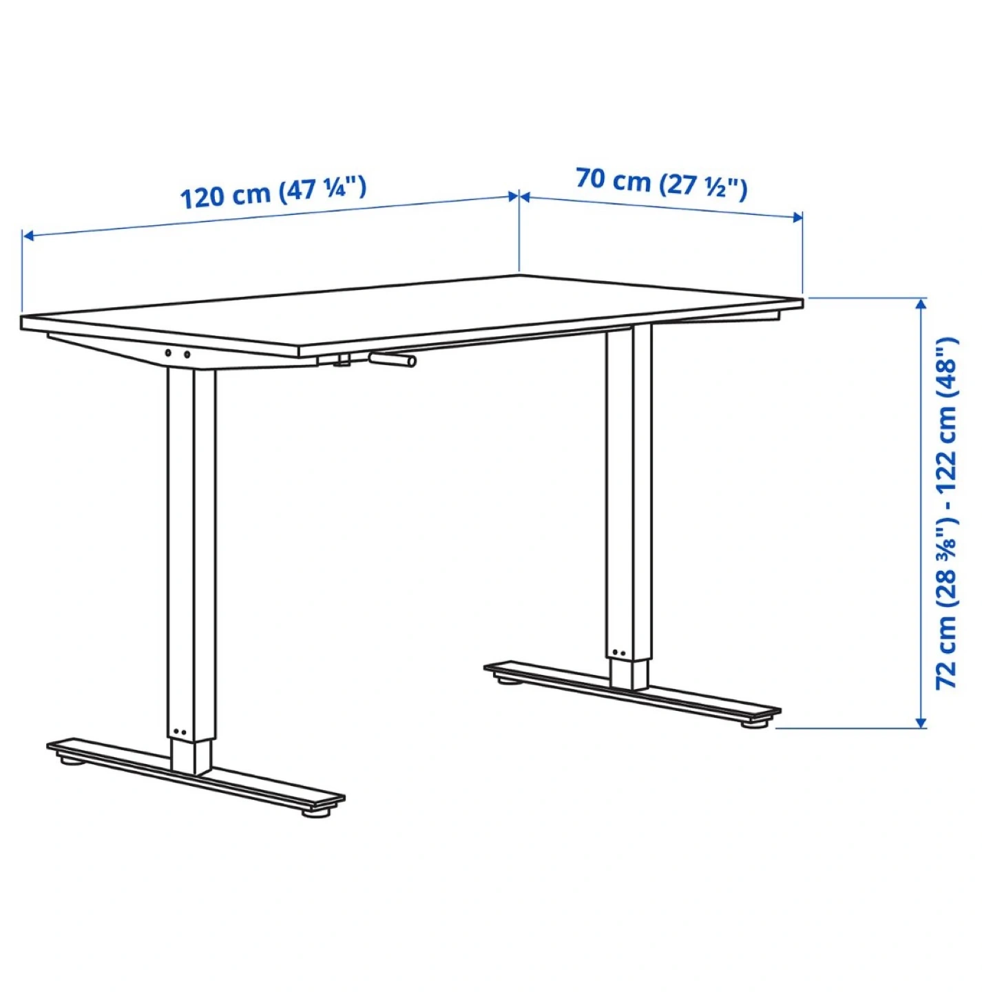 This is an IKEA TROTTEN sit/stand desk. It's beige and white and measures 120x70 cm. This desk allows for adjustable height to switch between sitting and standing. This one has a crank that doesn’t break like their motors.