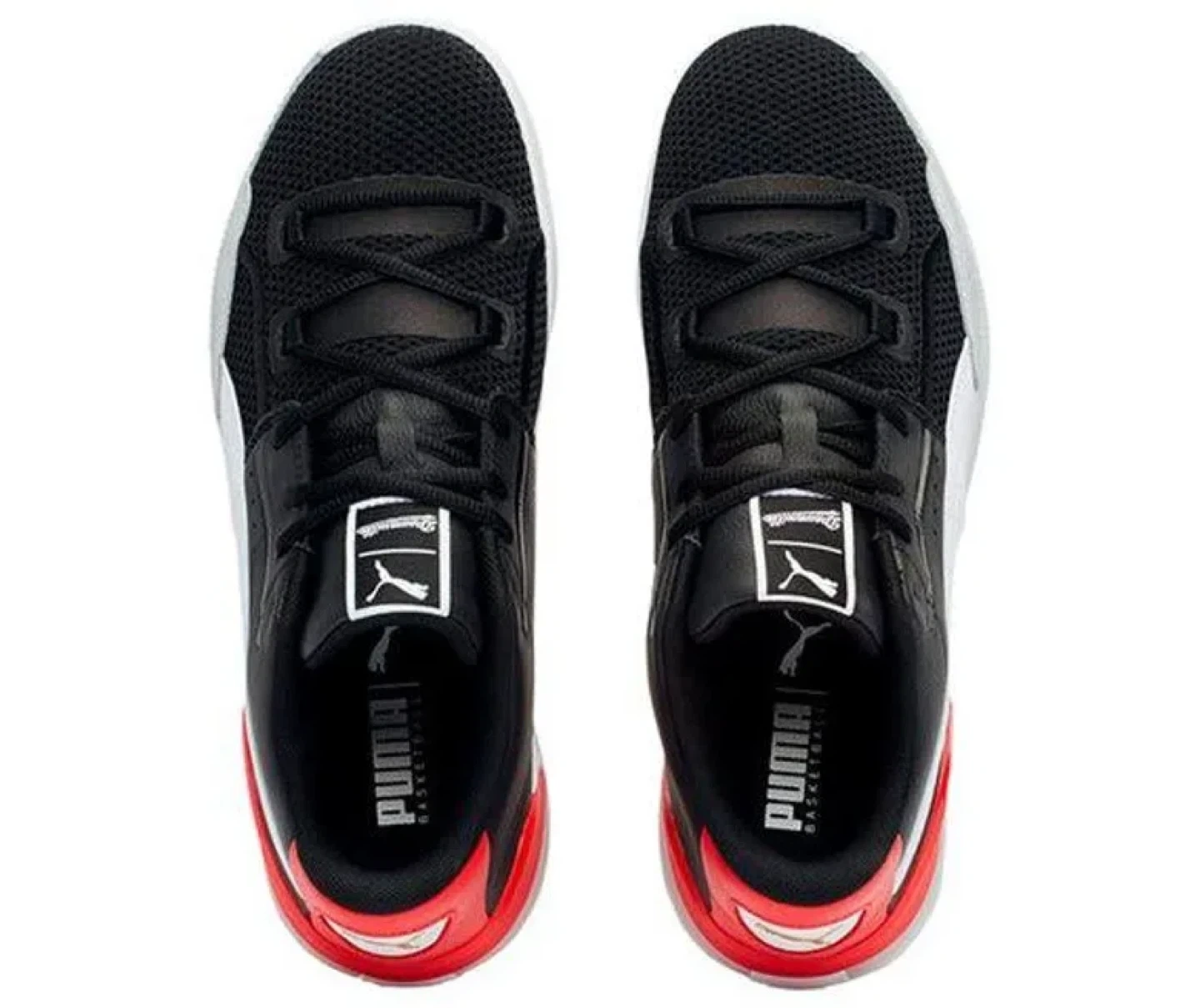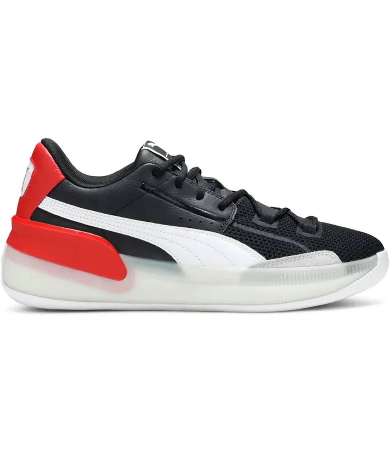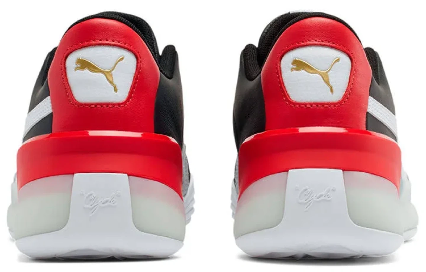 These are Puma Clyde All-Pro basketball shoes in black, white, and red. They're designed for performance on the court. The shoes have a durable rubber outsole for traction.