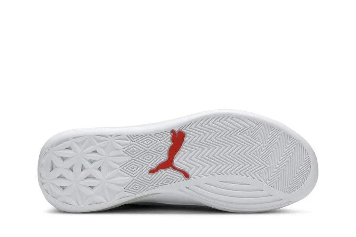 These are Puma Clyde All-Pro basketball shoes in black, white, and red. They're designed for performance on the court. The shoes have a durable rubber outsole for traction.