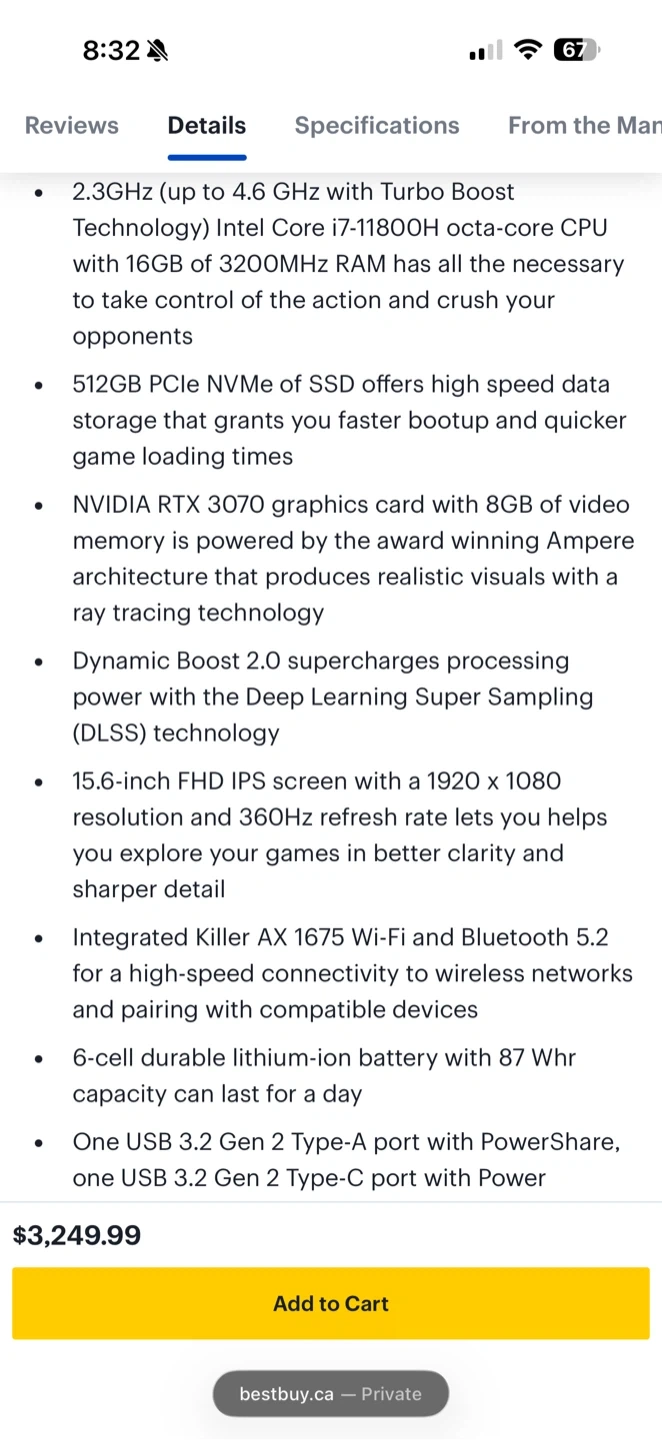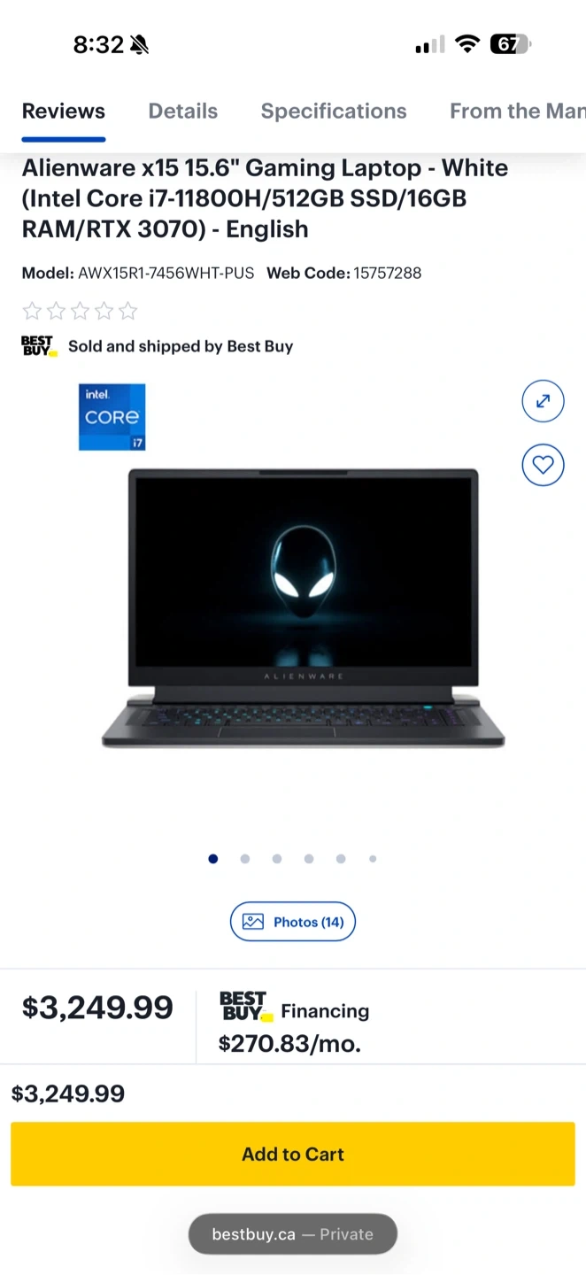This Alienware x15 gaming laptop has an Intel Core i7-11800H CPU and 16GB RAM. It comes with a 512GB SSD and an NVIDIA RTX 3070 graphics card.