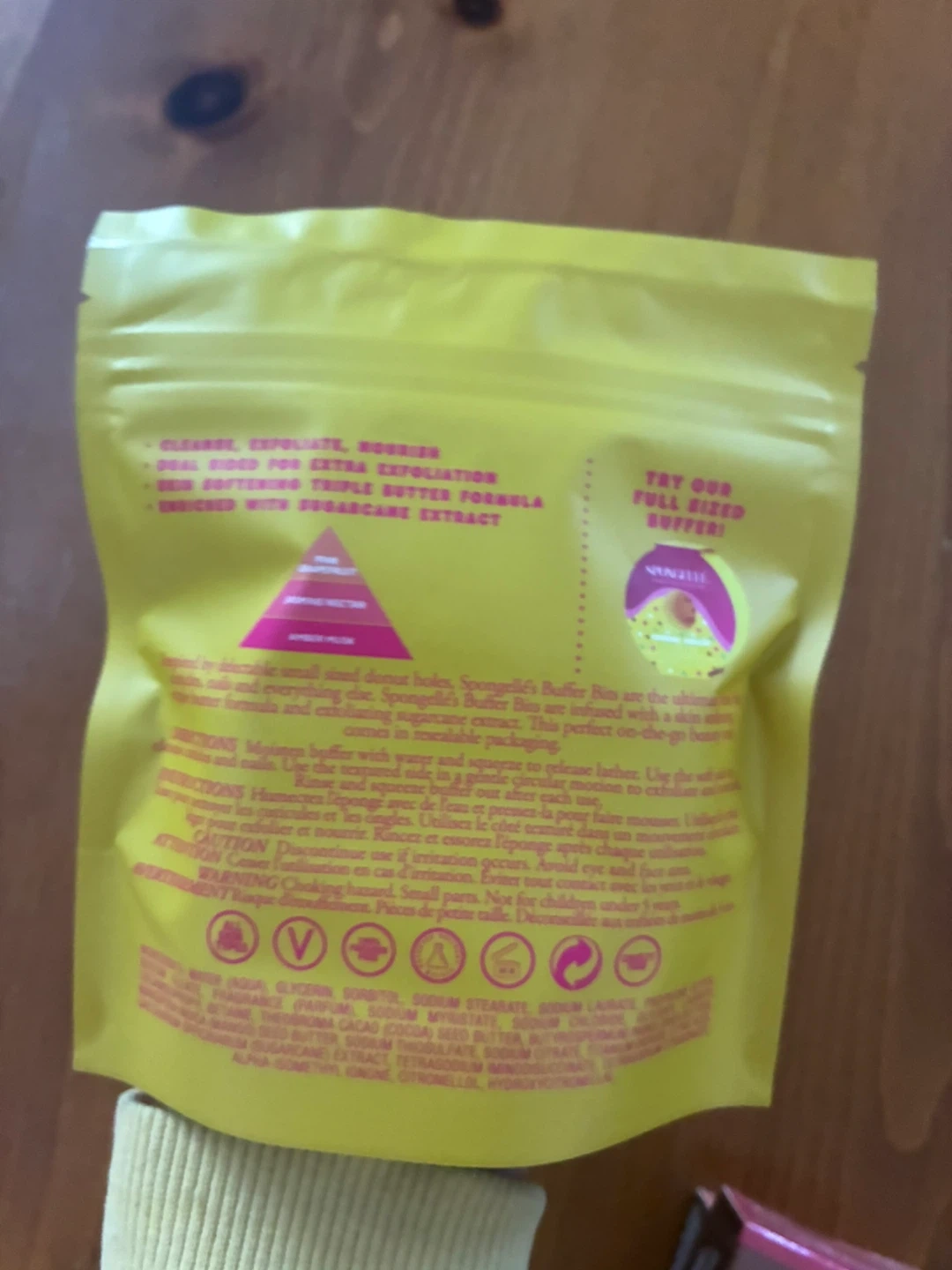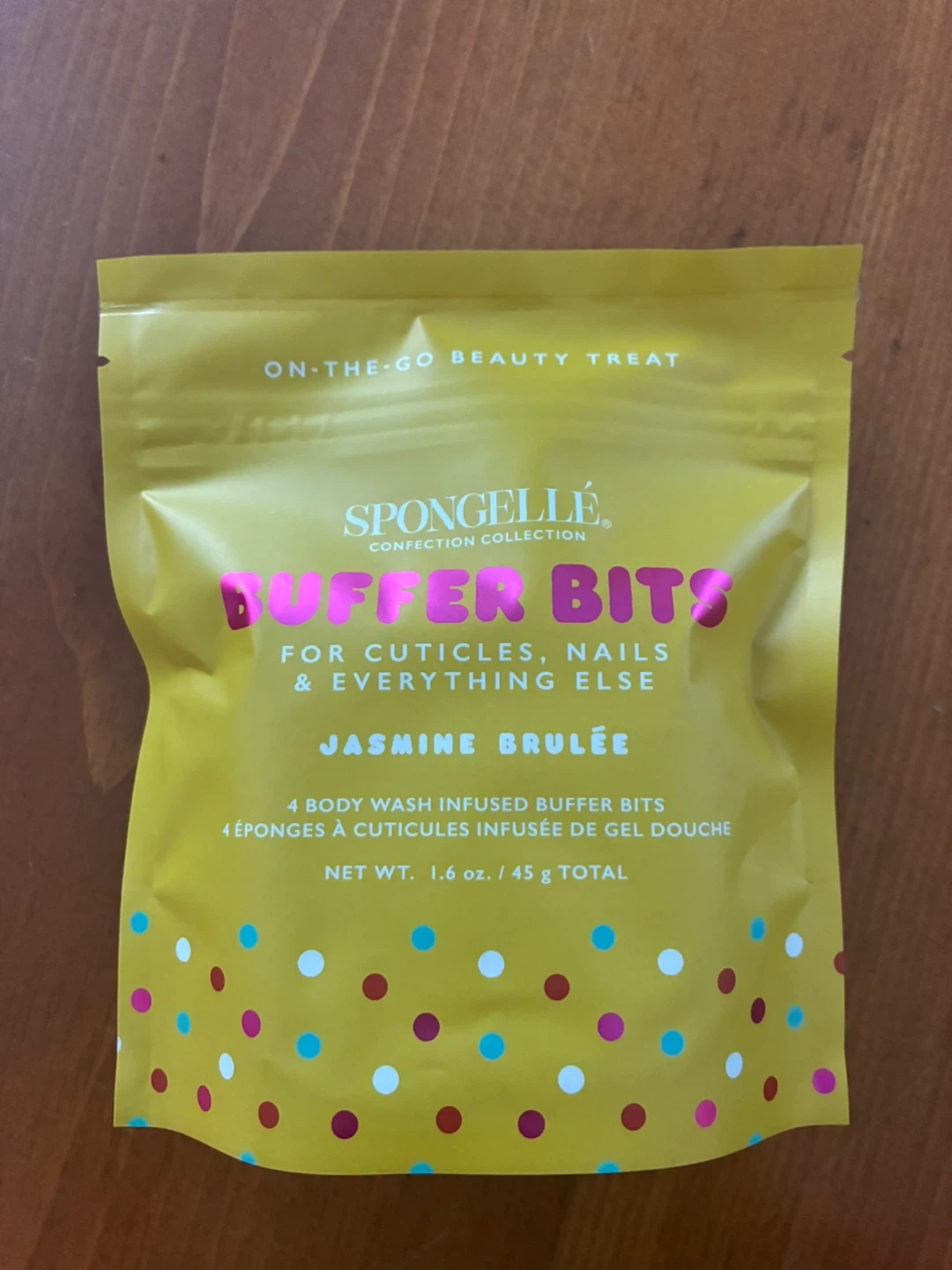 Spongellé's Buffer Bits are dual-sided for exfoliation and cleansing. Infused with triple butter formula and enriched with sugarcane extract. Each bit is a body wash infused buffer. Net wt. 1.6 oz. / 45 g total.