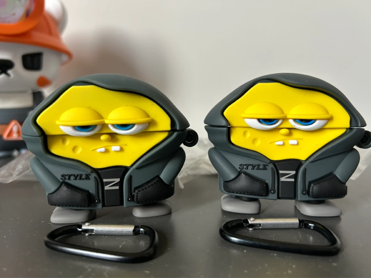This listing is for two cute Spongebob-themed silicone cases designed for AirPods 1 and 2. They're made from durable silicone material and each comes with a carabiner clip for easy attachment. These cases offer protection and a fun, unique look for your AirPods!