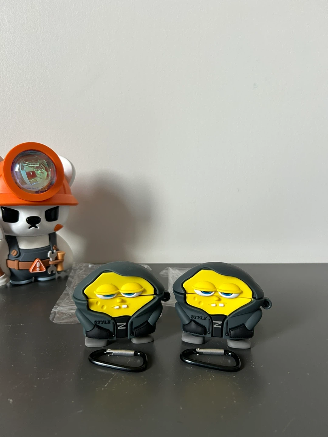 This listing is for two cute Spongebob-themed silicone cases designed for AirPods 1 and 2. They're made from durable silicone material and each comes with a carabiner clip for easy attachment. These cases offer protection and a fun, unique look for your AirPods!