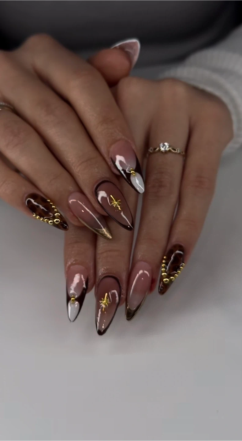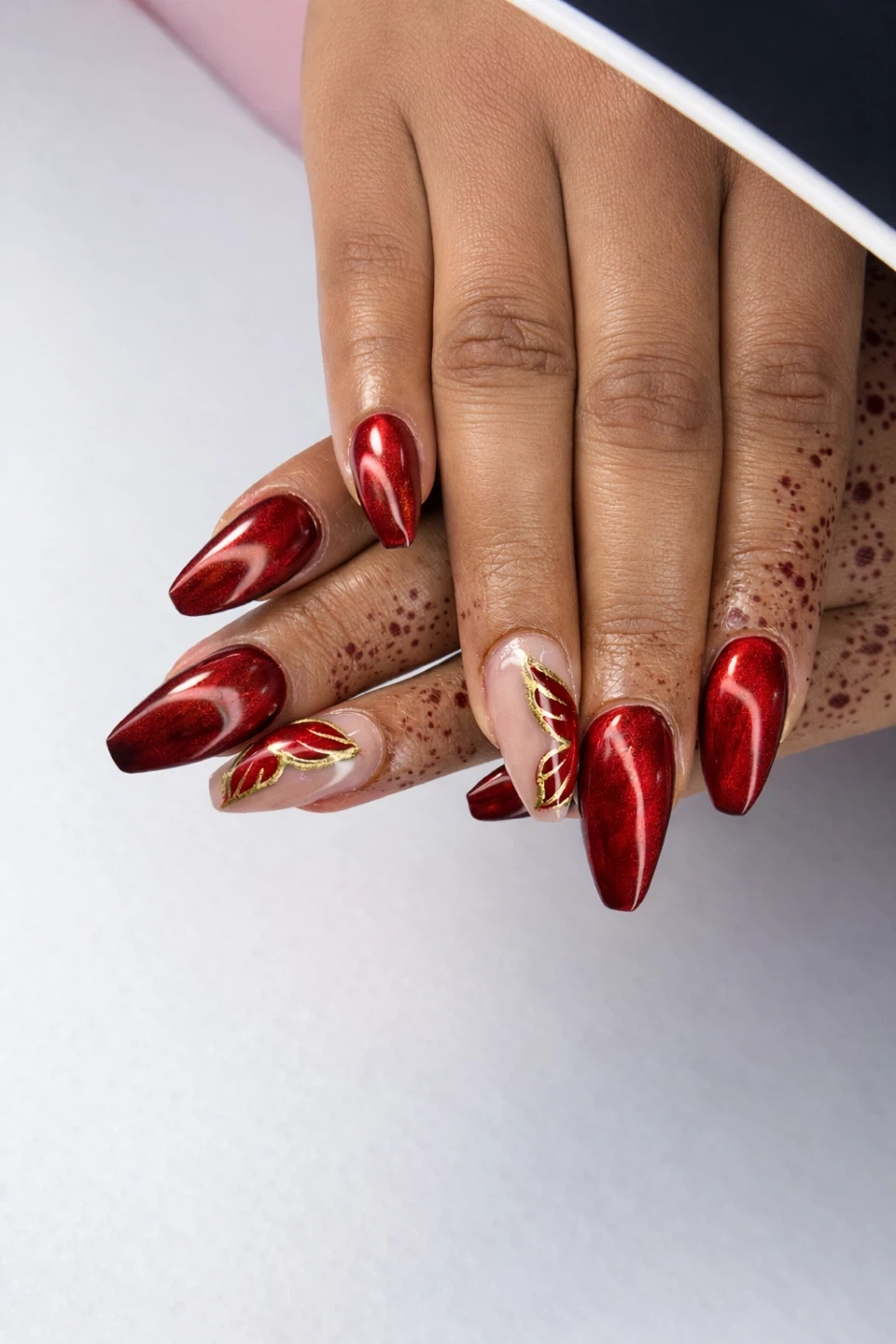 Acrylic nail designs including red metallic, floral, polka dot, and brown/gold abstract styles. Each set offers a unique look for your nails.