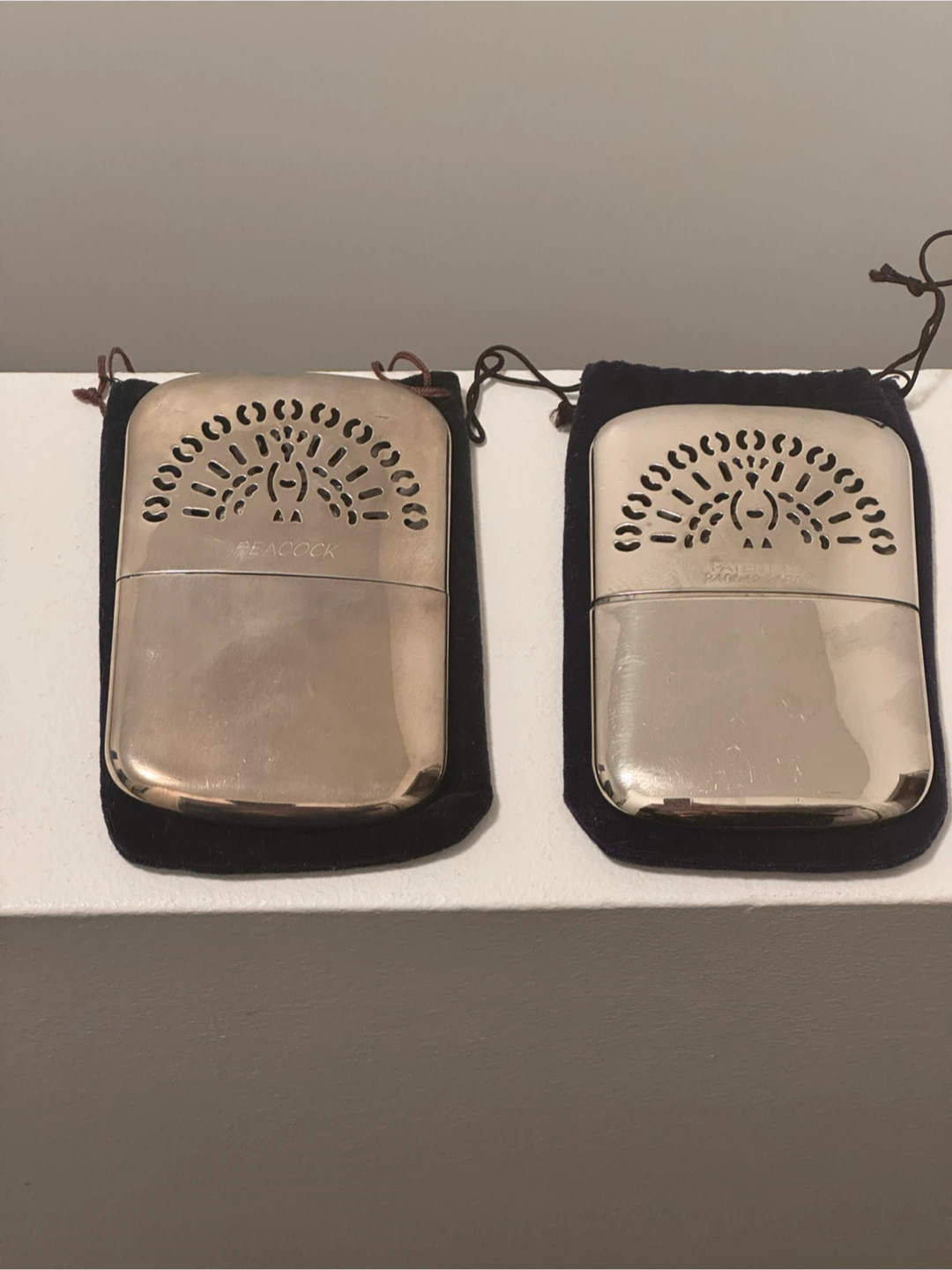 Two vintage/antique hand warmers, labelled Peacock. They're made of silver plated metal and come with protective velvet pouches. Each has a decorative vent pattern and is marked 'Made in Japan'.