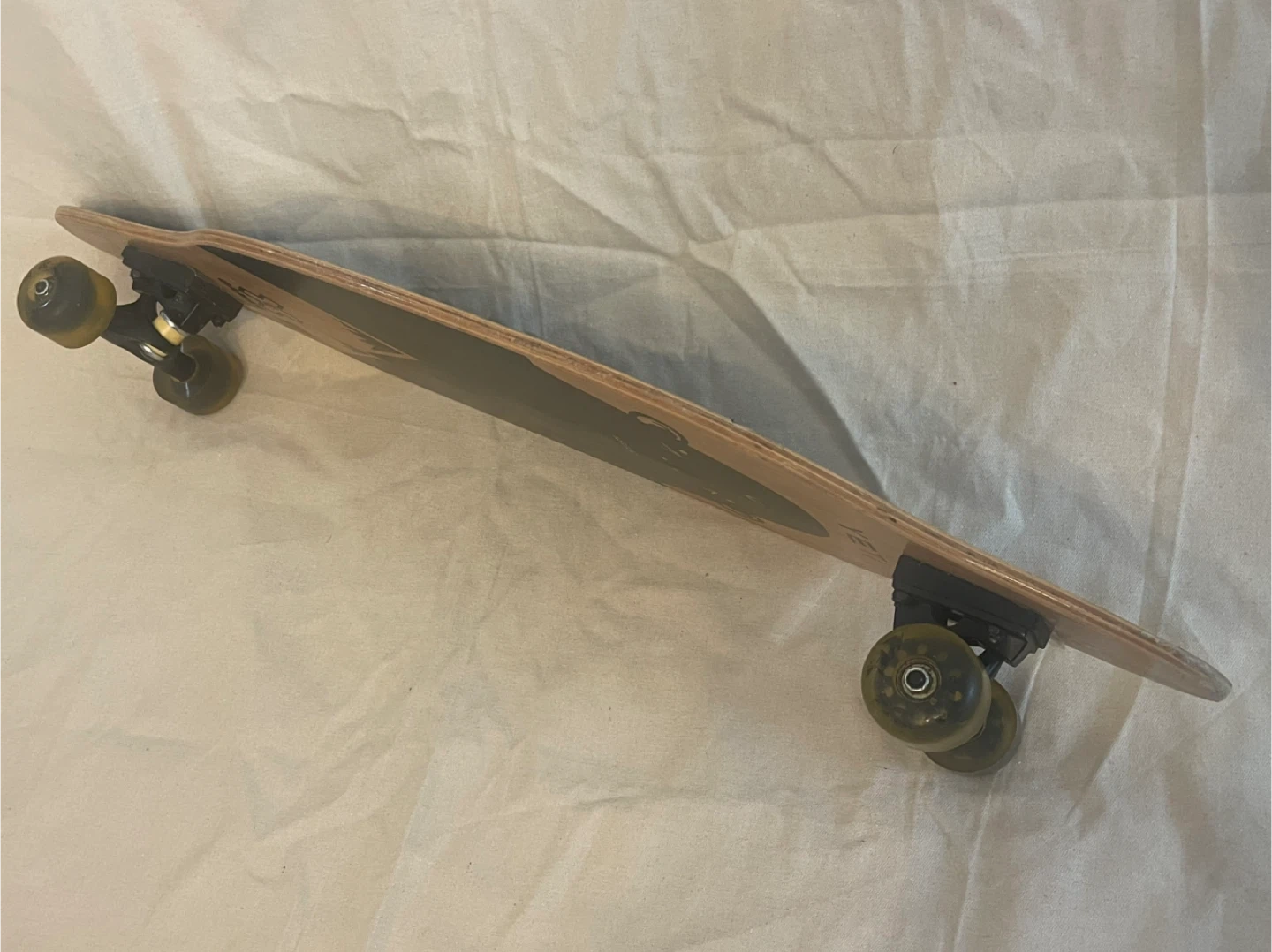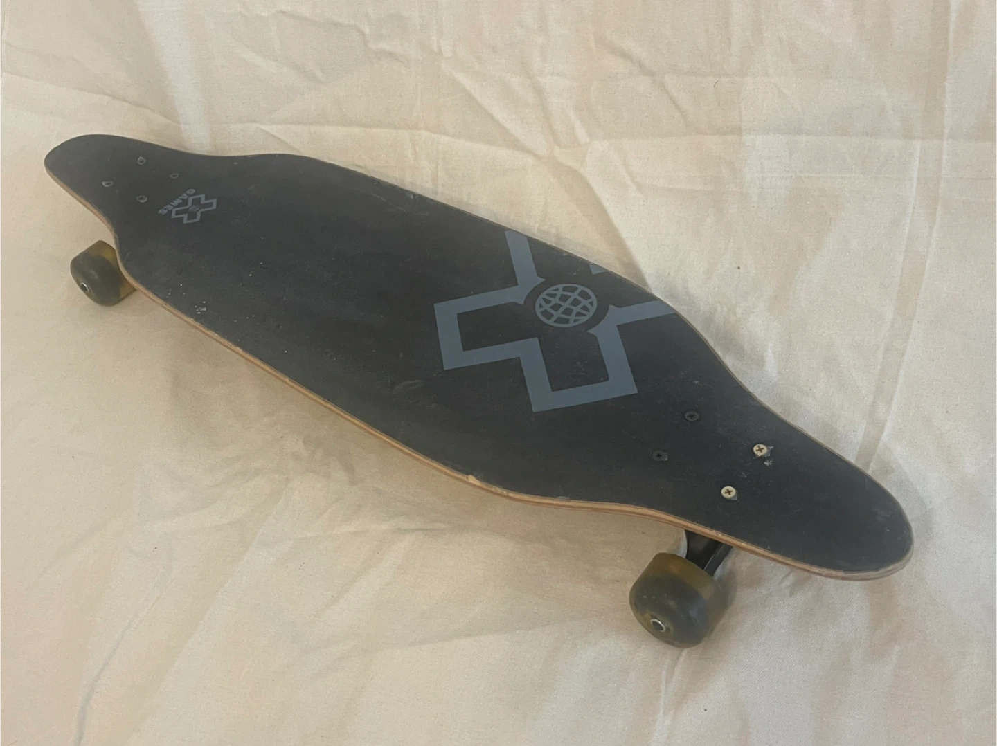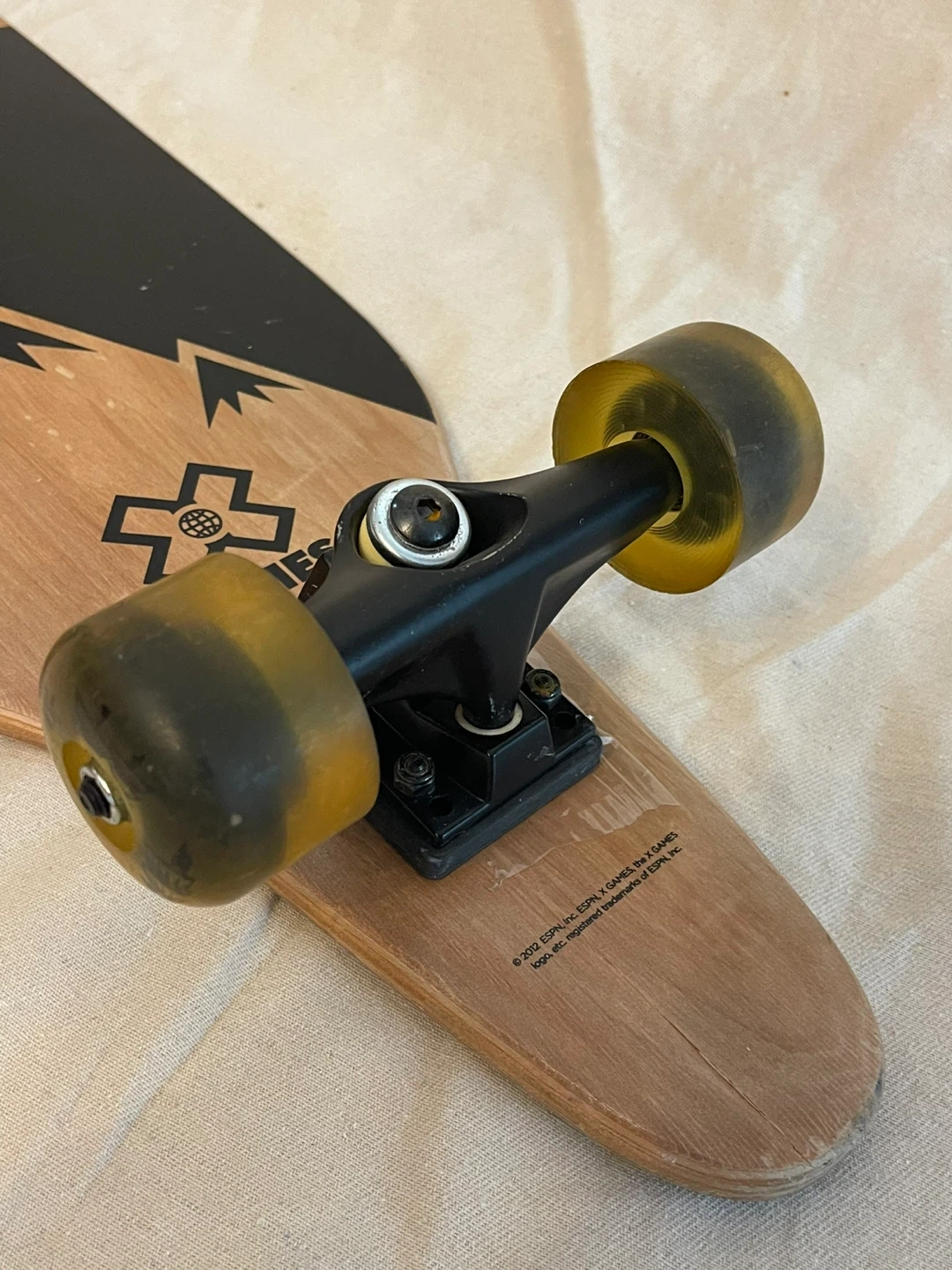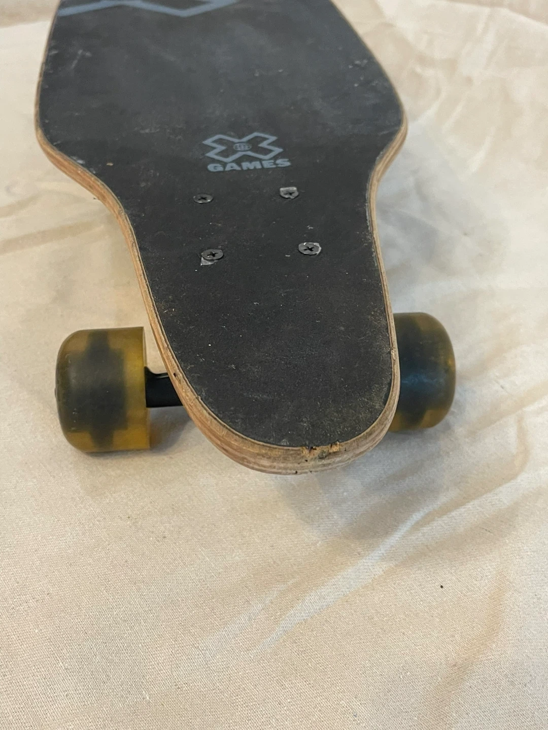 Here's an X Games 36” Yeti longboard skateboard. It has a black and natural wood finish. It has been used and has some wear and tear.