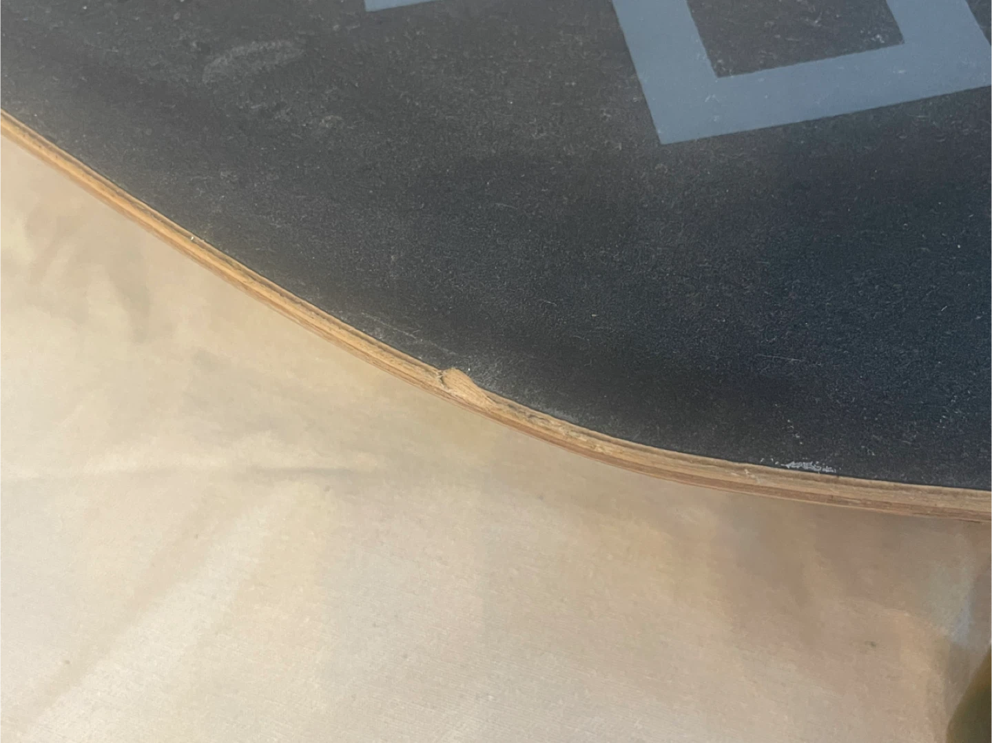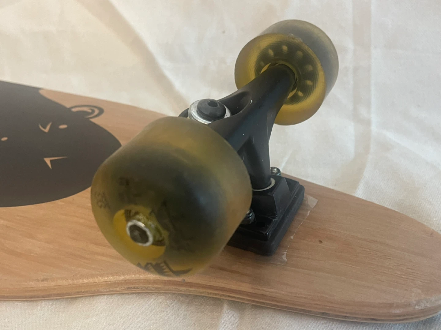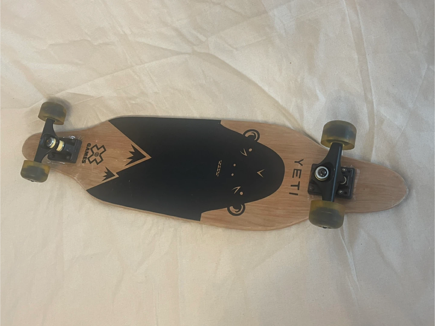 Here's an X Games 36” Yeti longboard skateboard. It has a black and natural wood finish. It has been used and has some wear and tear.