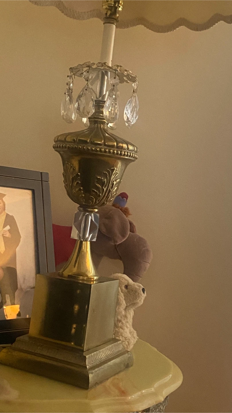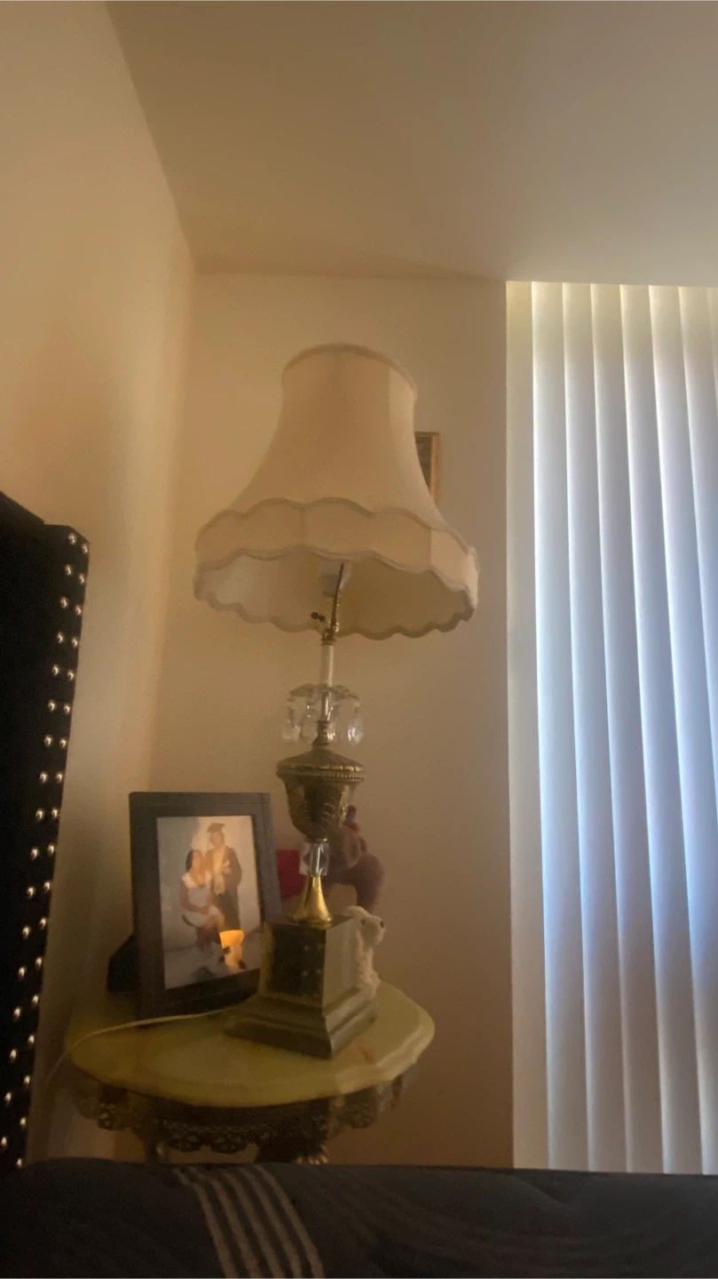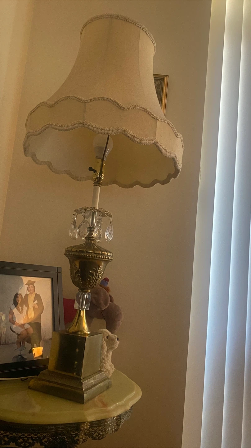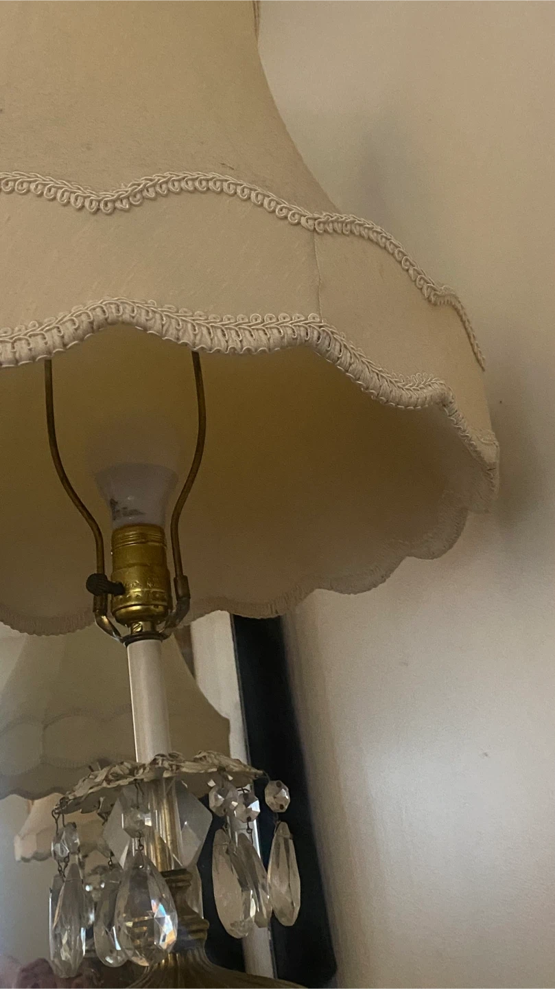 A pair vintage table lamps with a brass base and crystal accents. It has a decorative, scalloped lampshade. Adds a touch of elegance to any room!