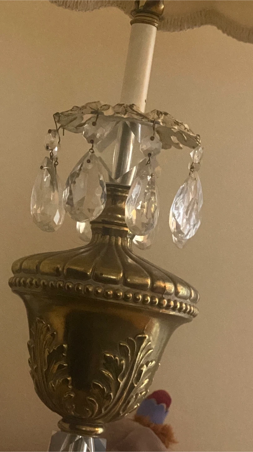 A pair vintage table lamps with a brass base and crystal accents. It has a decorative, scalloped lampshade. Adds a touch of elegance to any room!