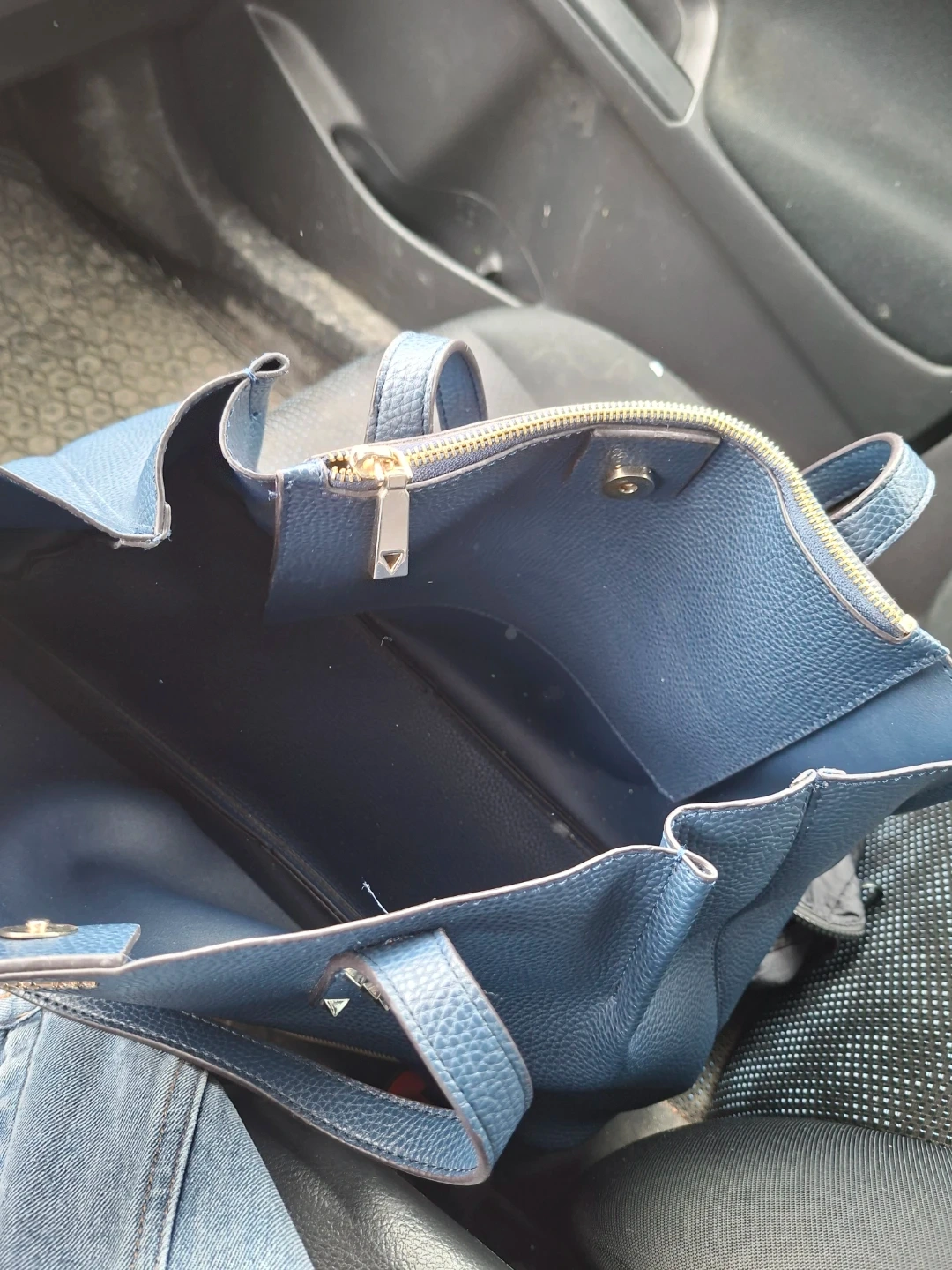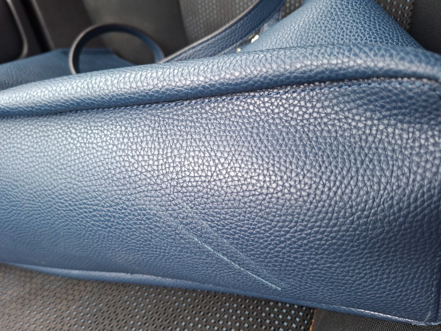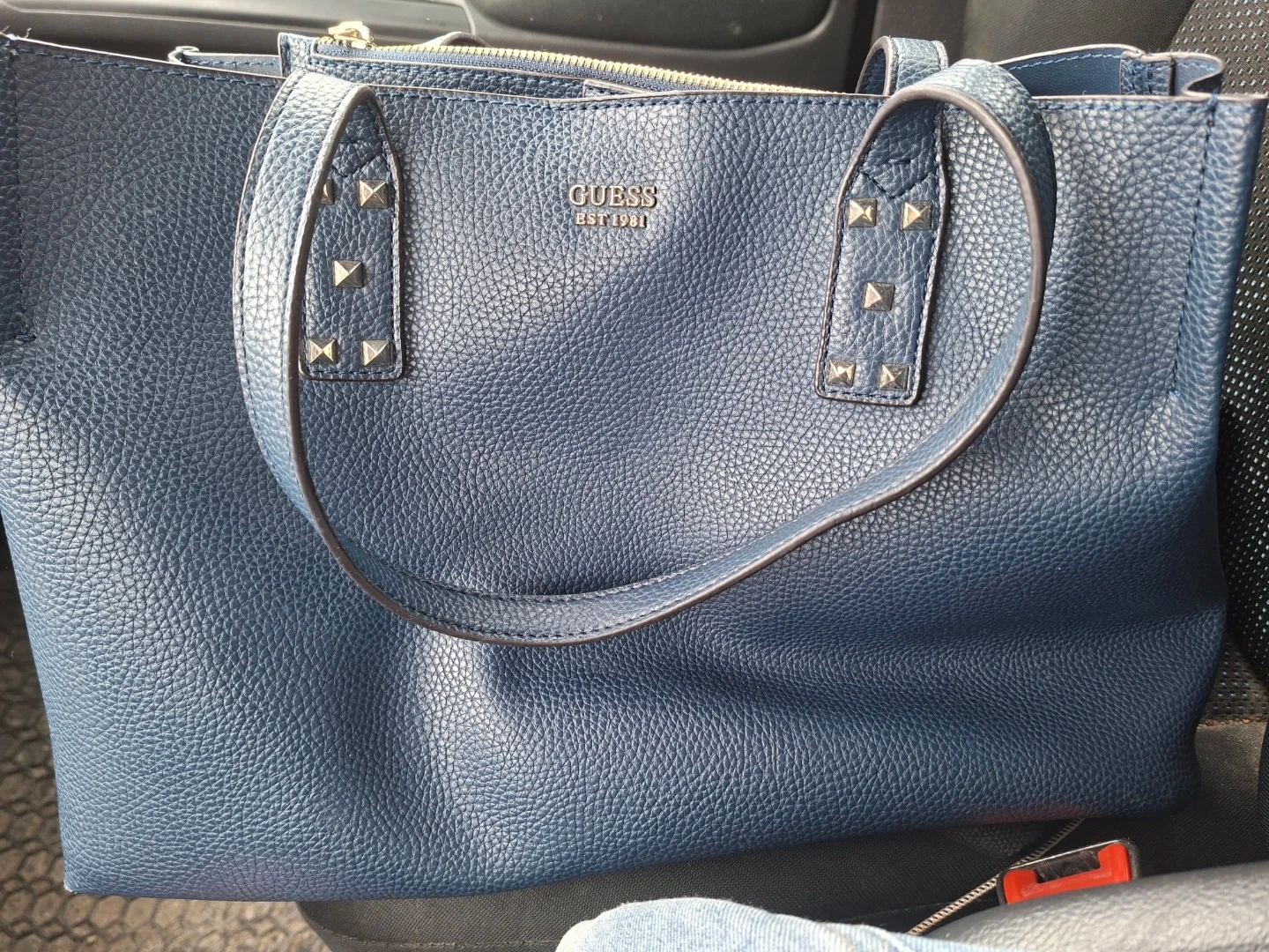 Navy blue textured Guess tote bag. It's made of faux leather and features silver stud accents. This bag's versatile style makes it suitable for everyday use.