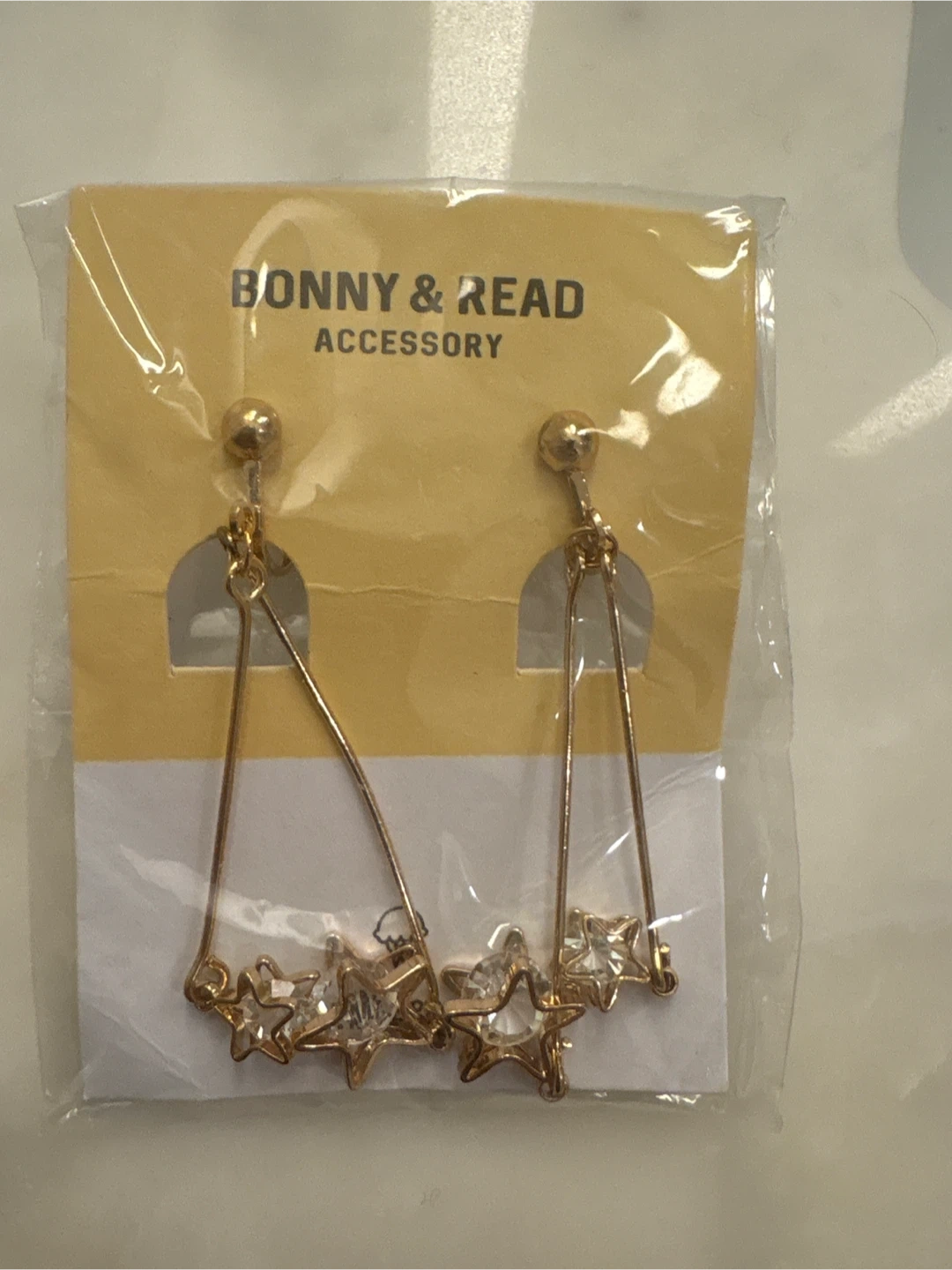 These dangle earrings feature a star design. They're gold-toned with clear crystal accents. Great for adding a touch of sparkle to any outfit!