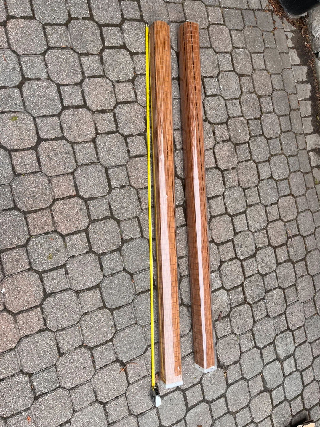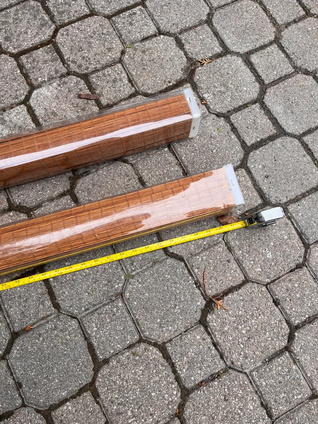 Two new bamboo blinds, each measuring approximately 24 inches wide. They're still in their original plastic packaging. Perfect for adding a natural touch to any room!