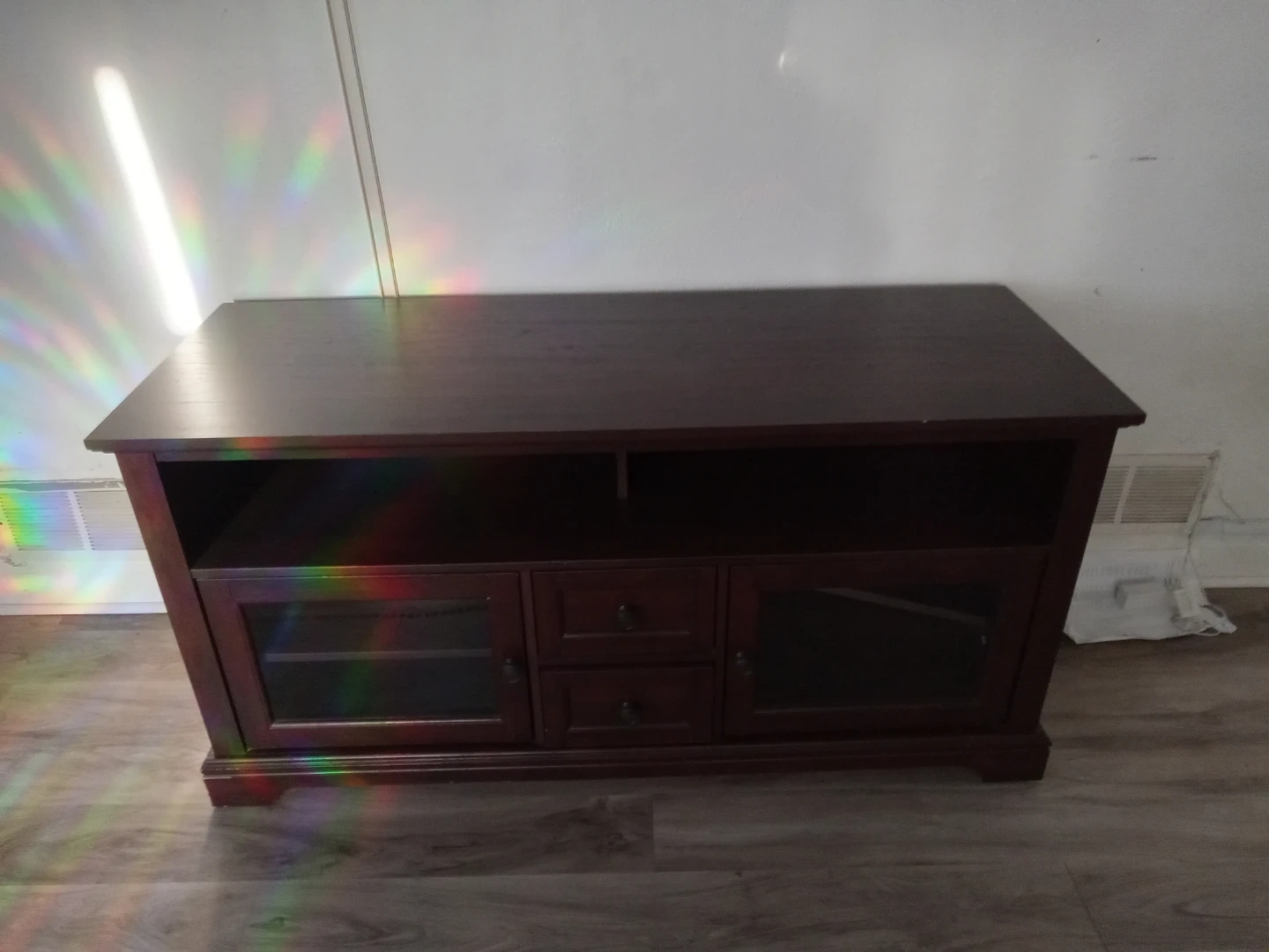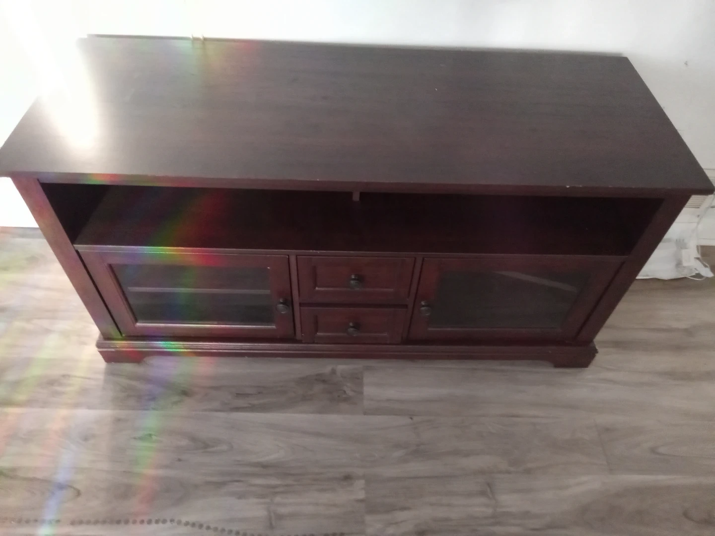 This is a dark wood TV stand, perfect for your living room. It features two glass-door cabinets and three drawers for storage. The open shelves offer space for media consoles or decor. It's sturdy and stylish!
