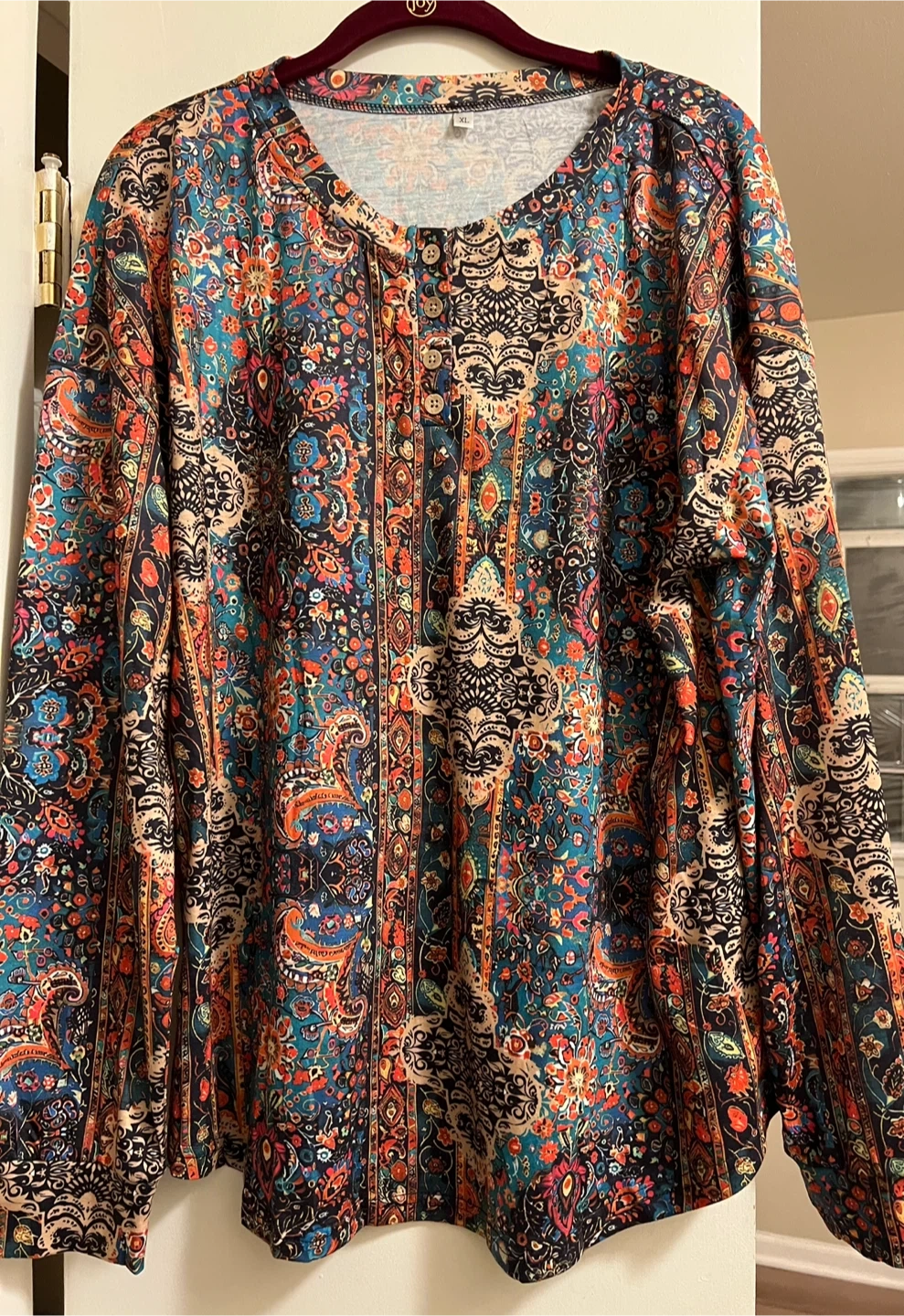 Here's a vibrant and eye-catching long-sleeve top in size XL! The colorful pattern is really unique. It has a button-up detail at the neckline. Perfect for adding a pop of color to your wardrobe! 29 1/2β L **Only tried on, never worn.**