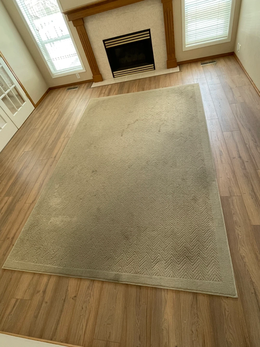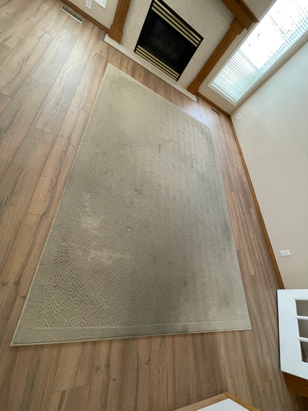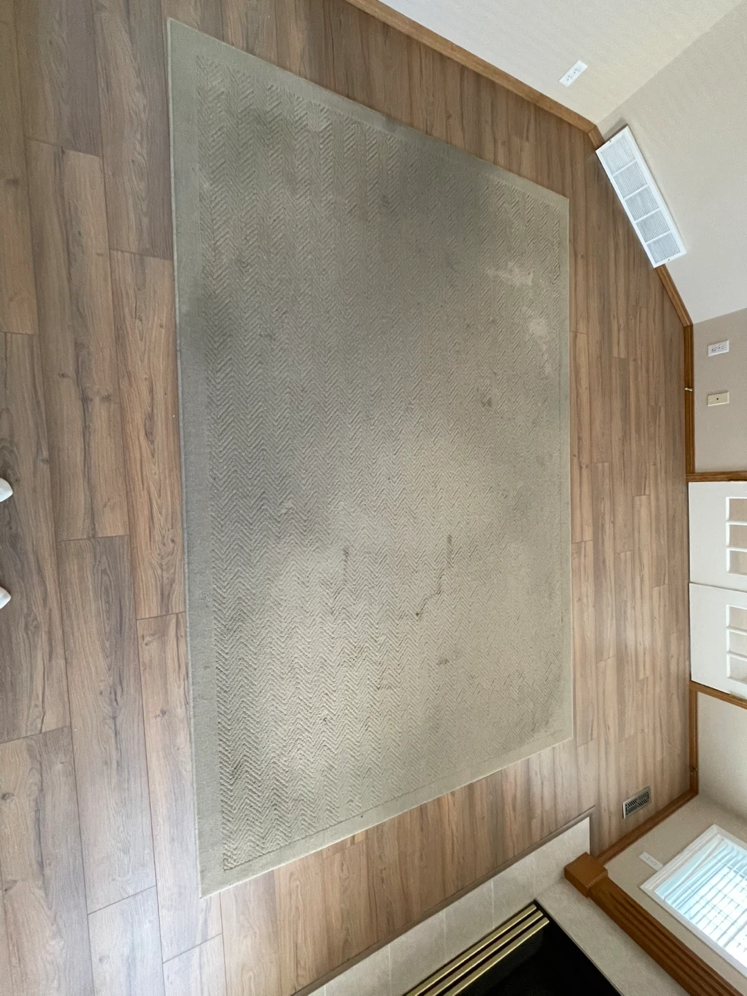 A large area rug with a subtle chevron pattern. It's a light neutral colour, suitable for various rooms. Adds warmth and style to your living space.