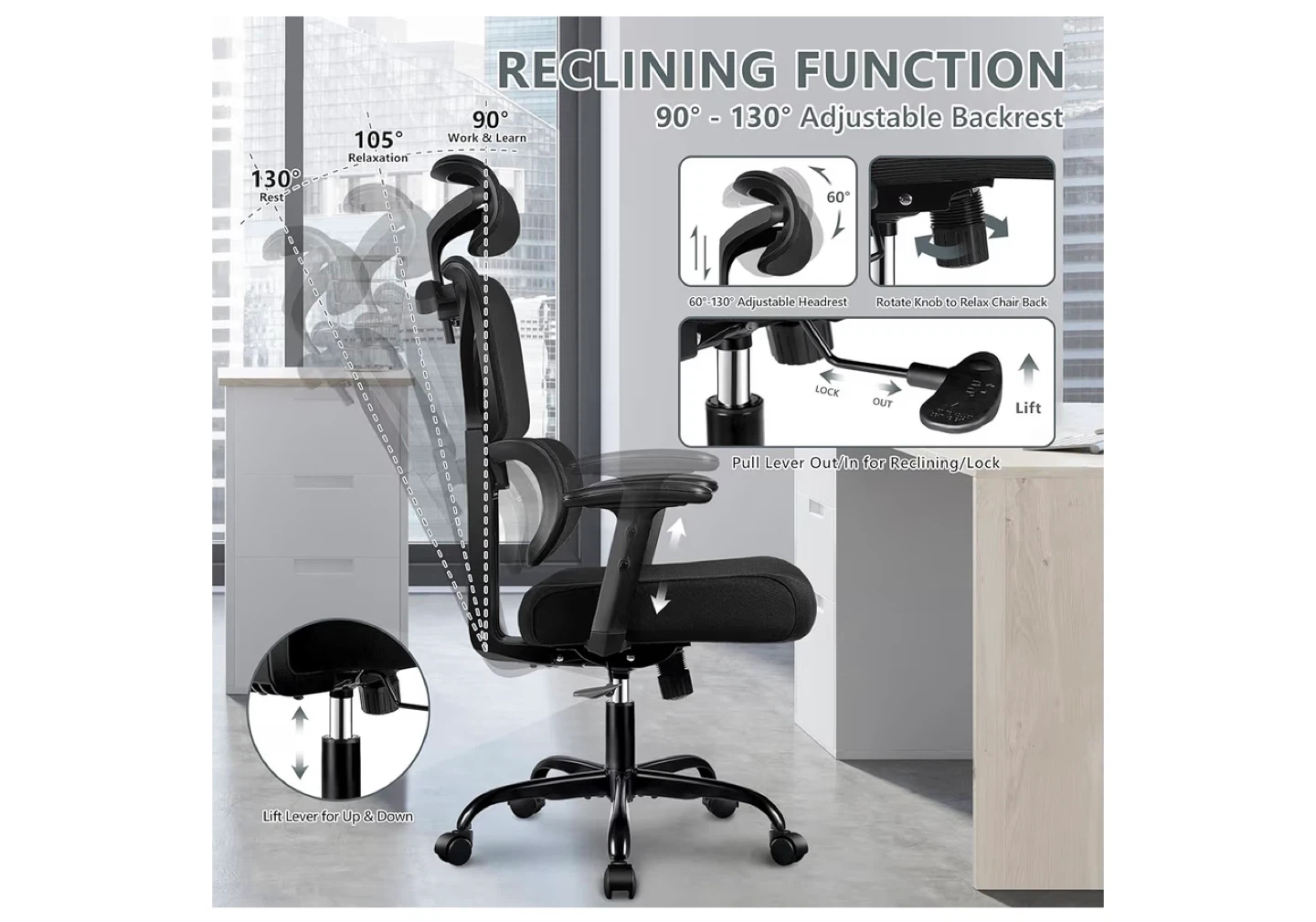 Premium features: Breathable mesh back, adjustable headrest (height/angle), coat hanger on the back, and sturdy metal base.