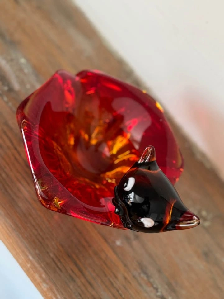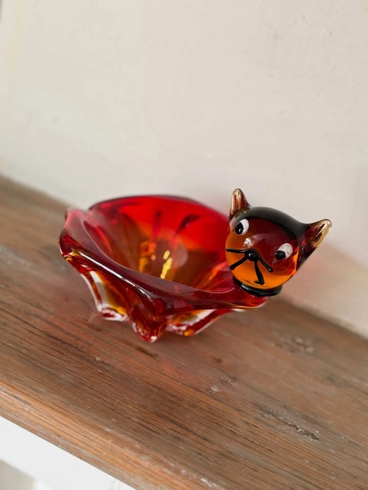 Vintage Mid-Century Art Glass Cat Bowl – Amber & Red Murano Styl