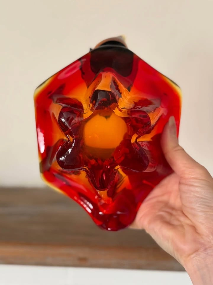 Add a pop of retro charm to your home with this stunning Vintage Art Glass Cat Bowl. This hand-blown sculptural piece features a vibrant gradient transitioning from a deep "Amberina" red to a warm honey amber.