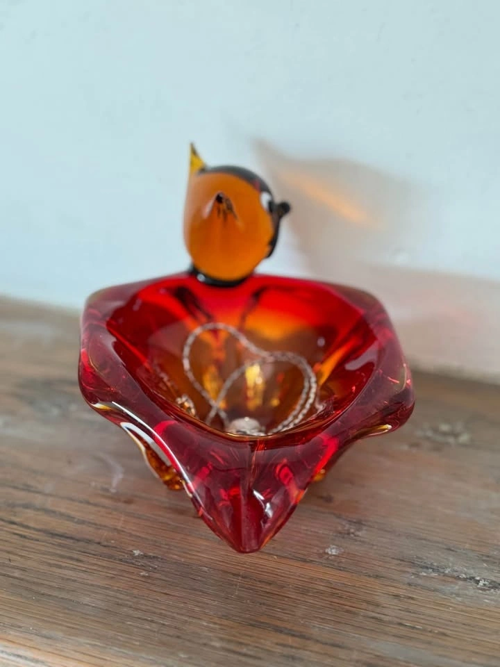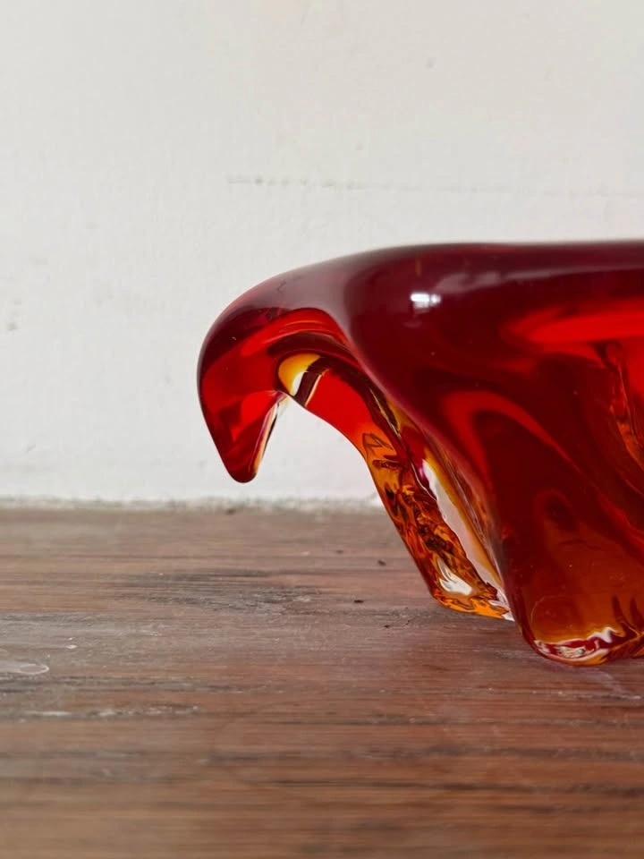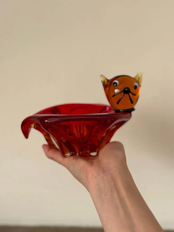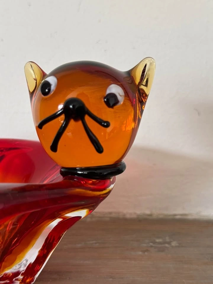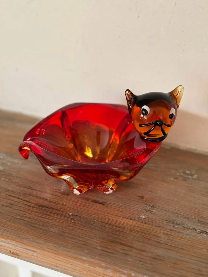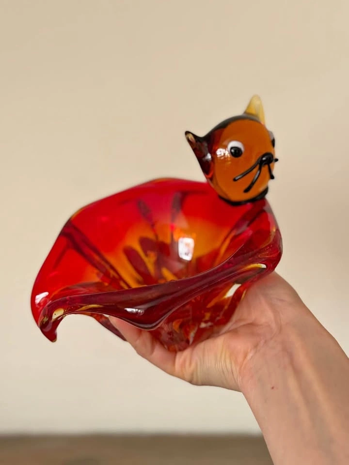 Vintage Mid-Century Art Glass Cat Bowl – Amber & Red Murano Styl