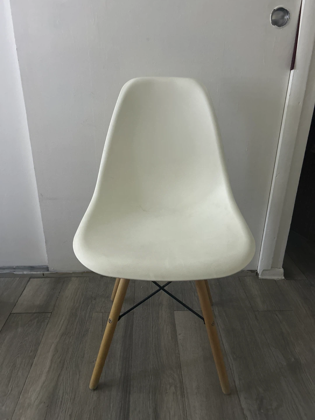 Selling a white Eames style dining chair. It's in great condition and would look great in any dining room or office space! The chair features a molded plastic seat and wooden legs.