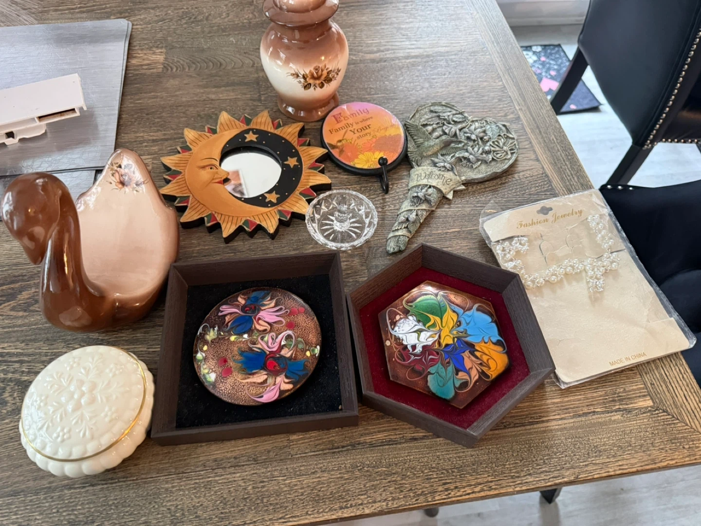 A collection of decorative pieces including a brown ceramic swan, a sun and moon mirror, a lidded trinket box, and two decorative enamel pieces. Also includes a new fashion jewelry necklace and a heart-shaped wall decor with 'Welcome' inscribed. Pickup Condo Bathurst and Steeles