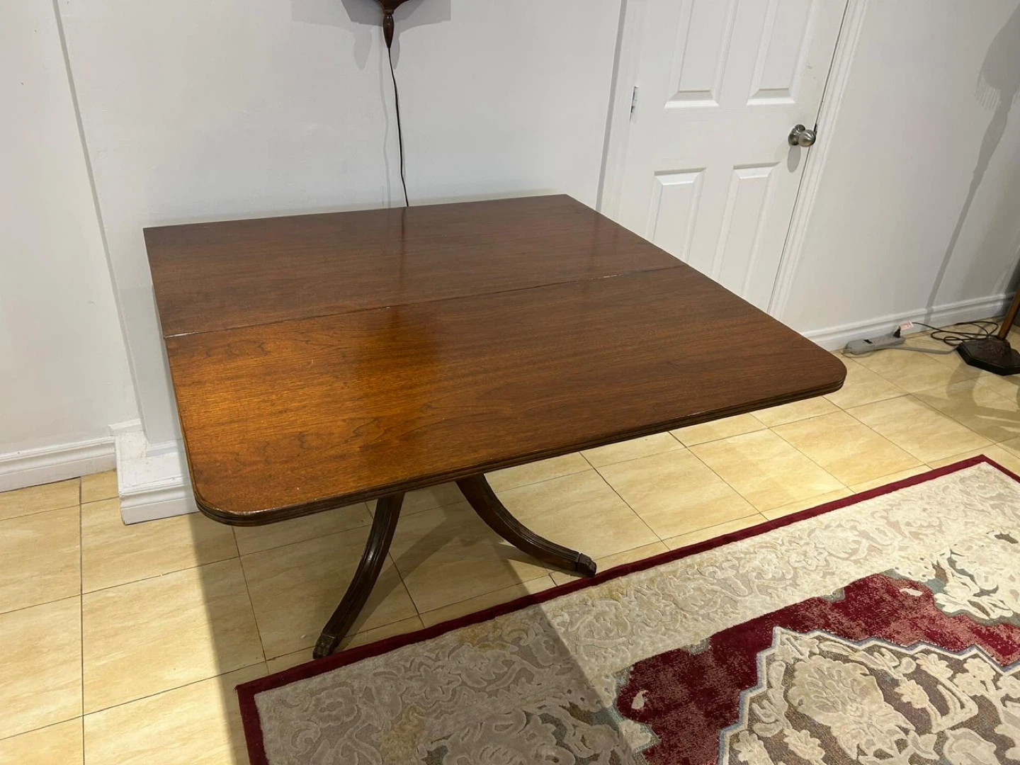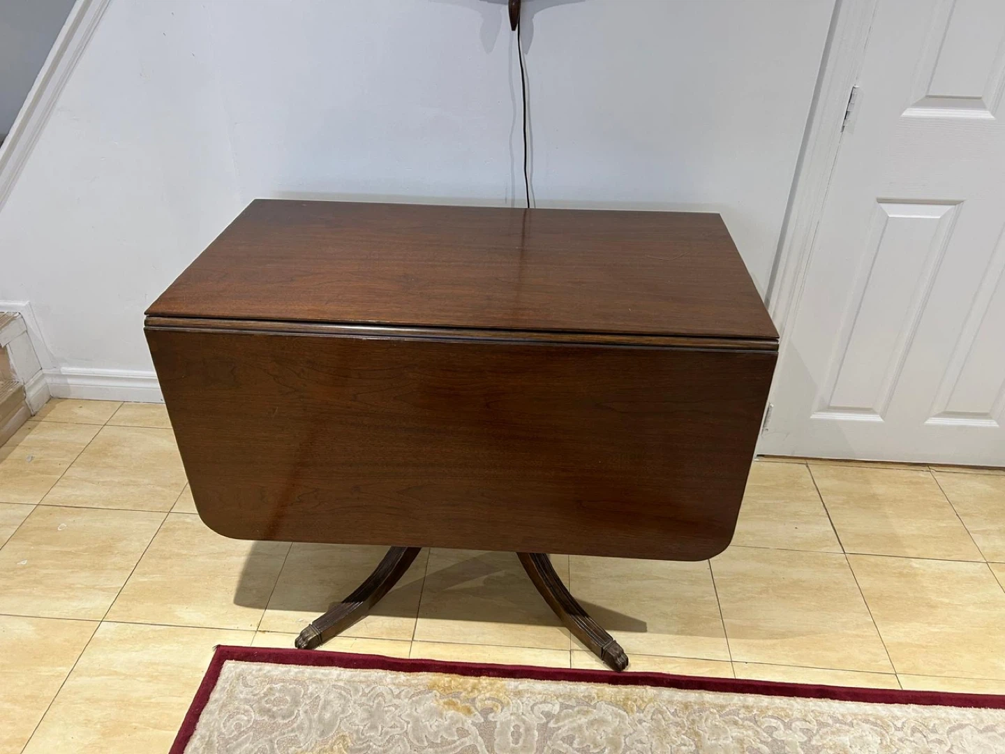 This is a classic dining table with a rich mahogany finish. It features drop leaves that can be folded down to save space. The table has a central pedestal base with curved legs and a single drawer.