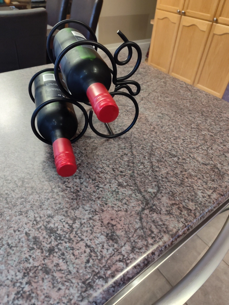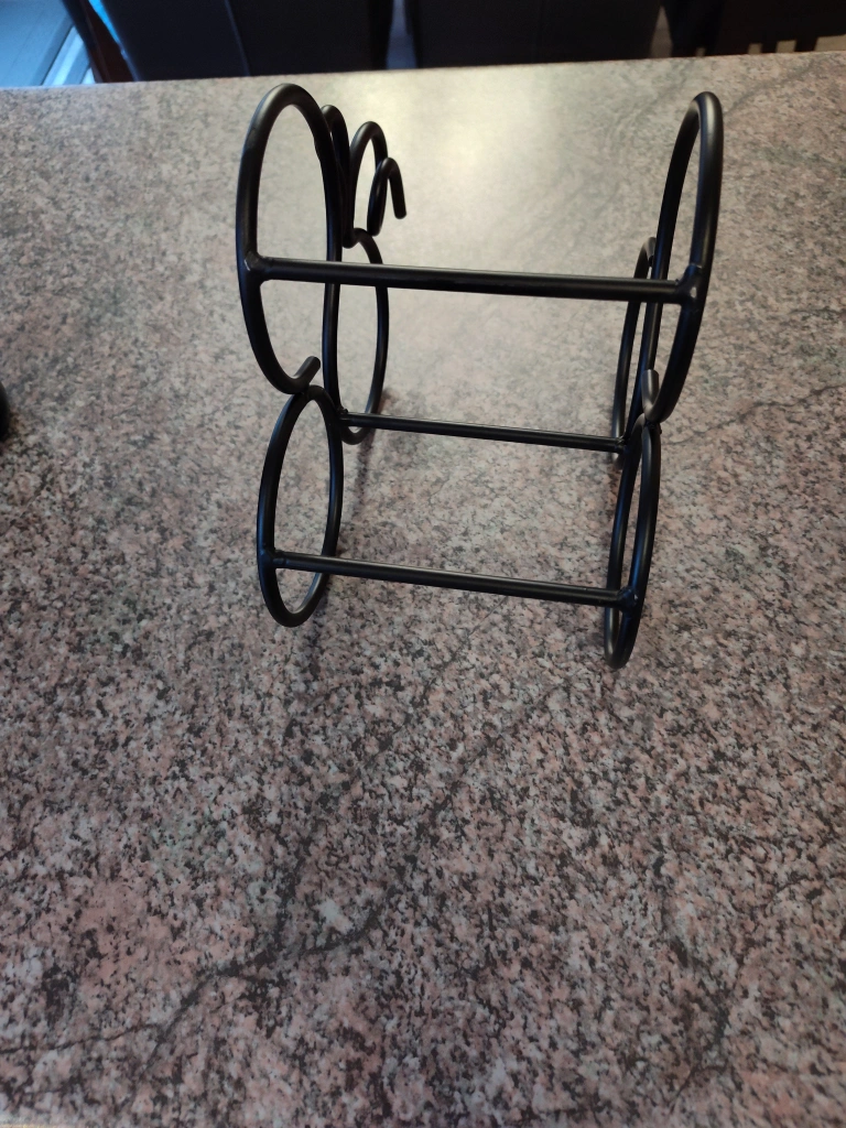 Black metal wine rack. Holds up to three bottles elegantly. Matt black color. New condition. Placed bottles are for display purposes only and are not included.