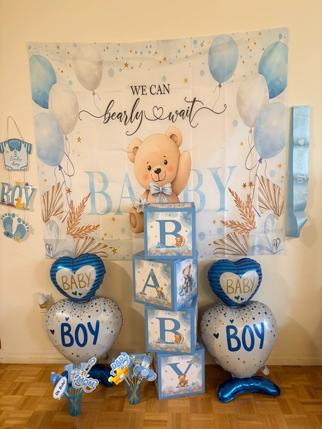 Complete baby shower decoration set featuring a 'We Can Bearly Wait' backdrop and 'Baby Boy' balloons. Includes letter blocks spelling 'BABY' and photo props. Perfect for a gender-reveal or baby boy celebration!