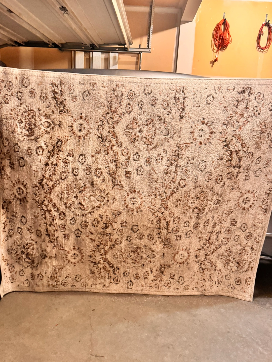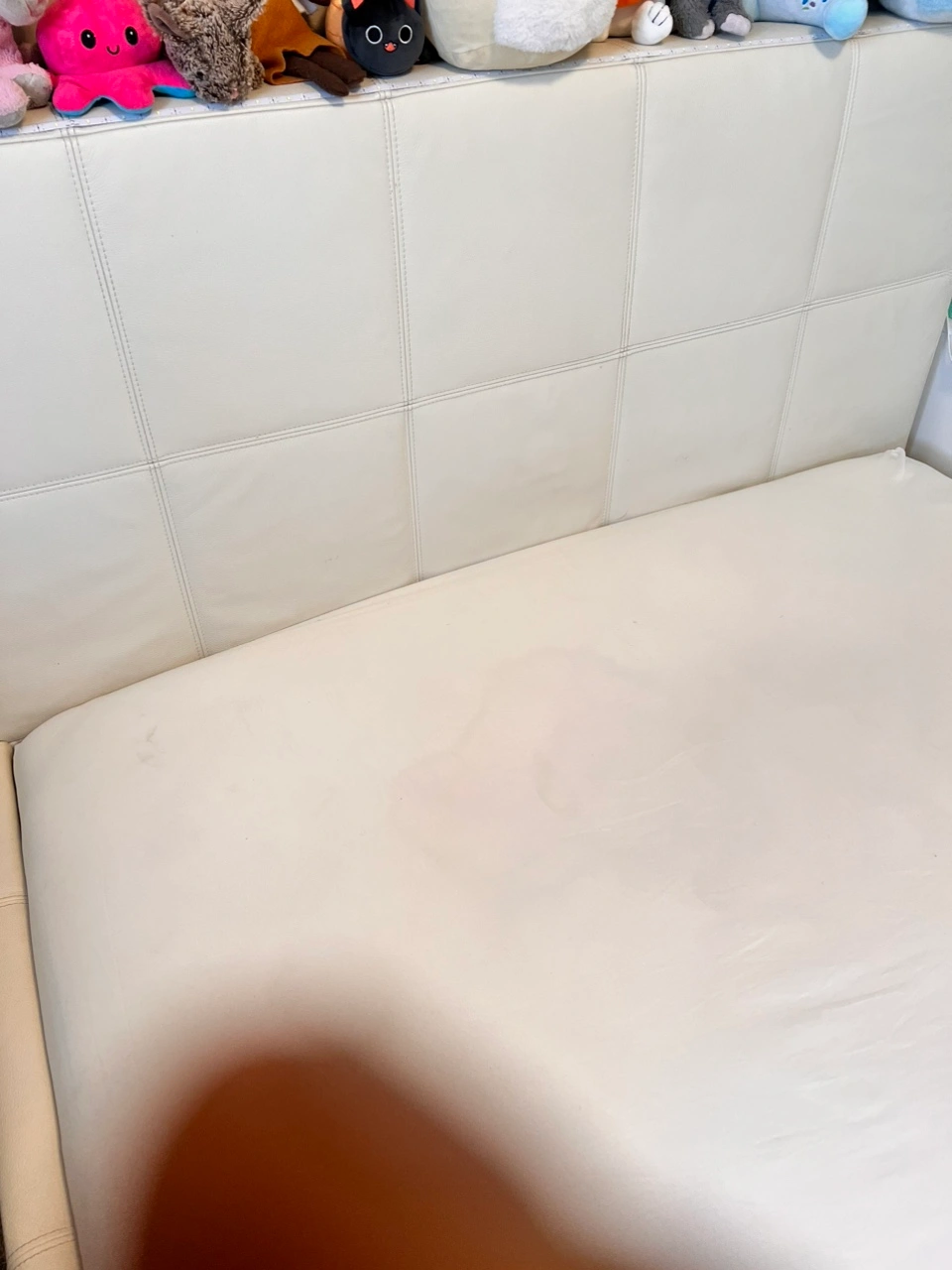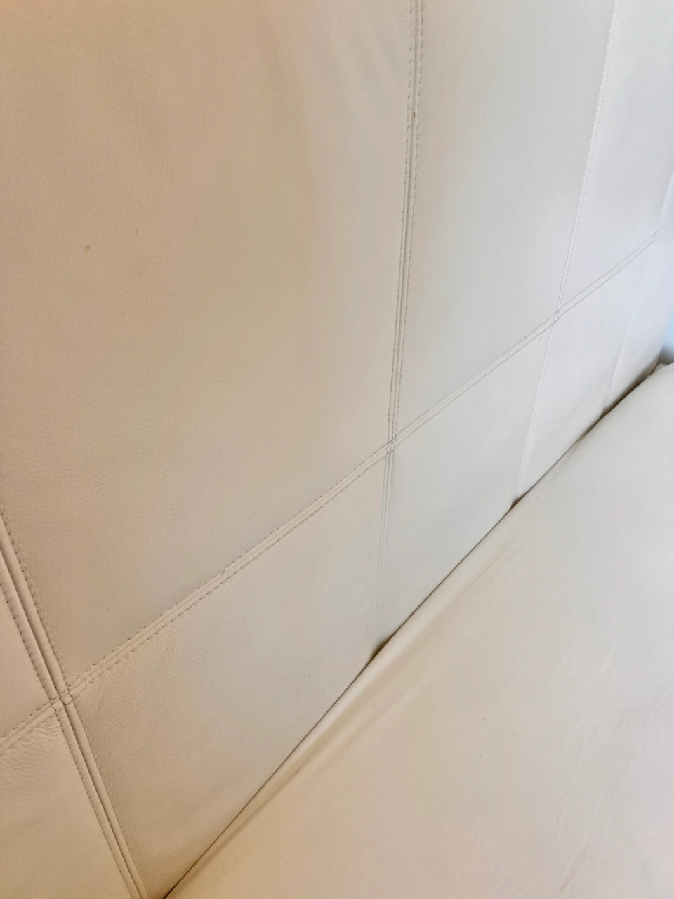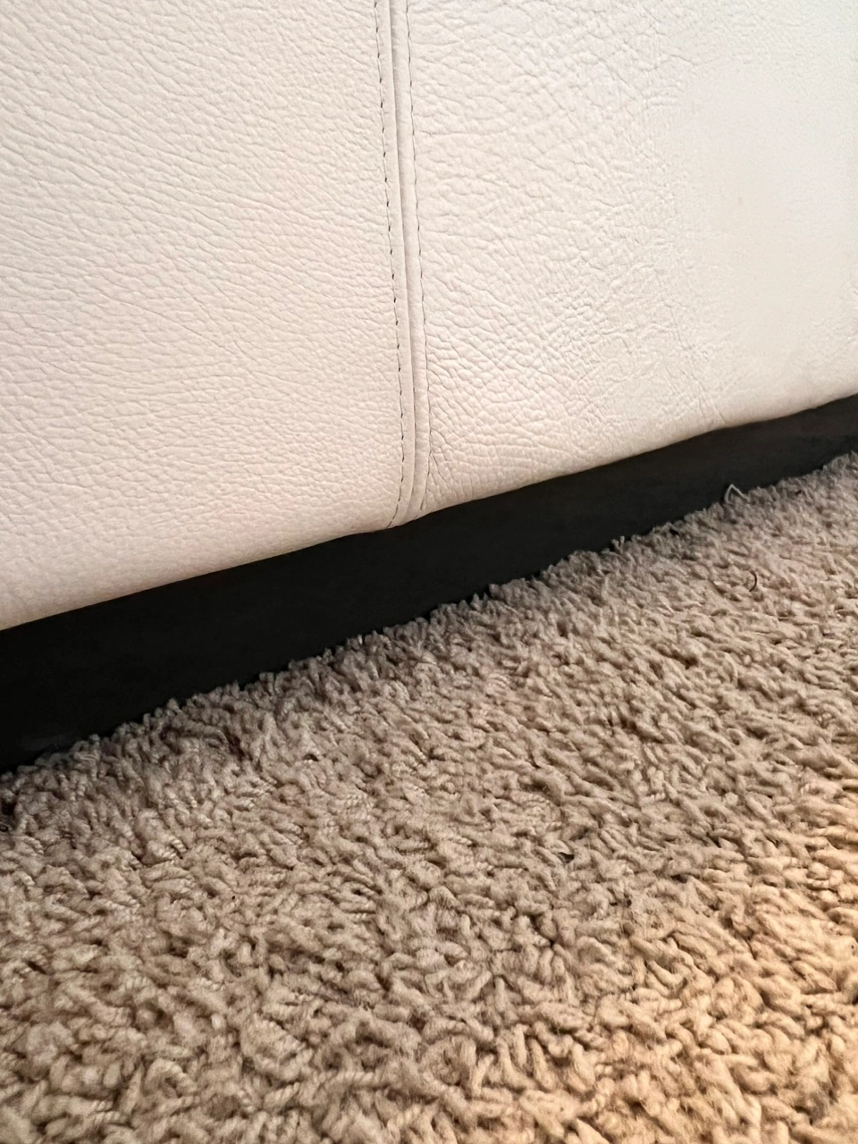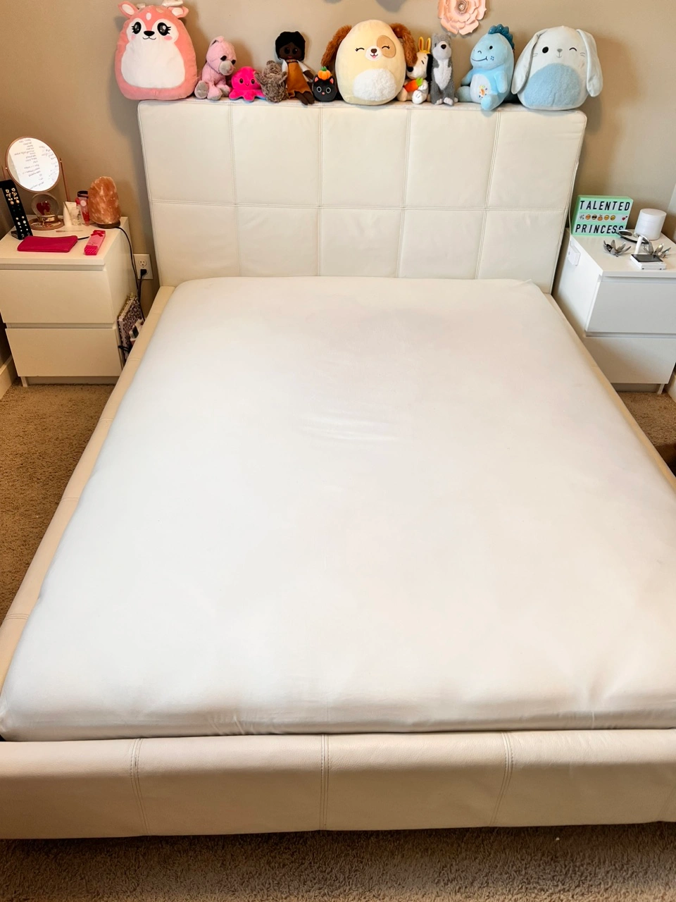 White faux leather bed frame with a tufted headboard. It has a low profile and includes a wooden slat system. The bed frame is easy to assemble and disassemble. As good as new. Available for pickup.