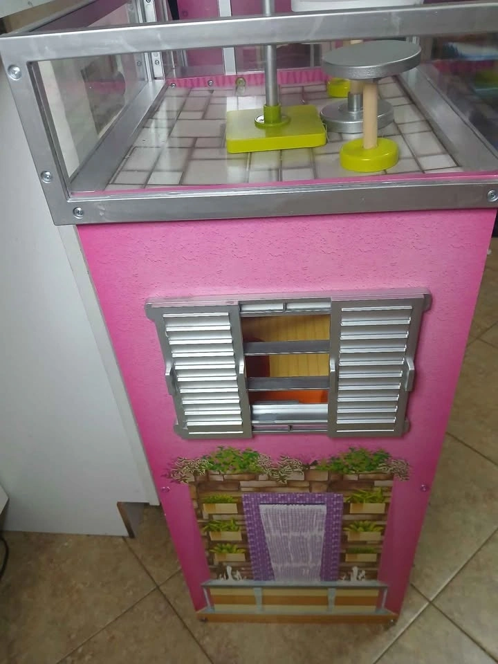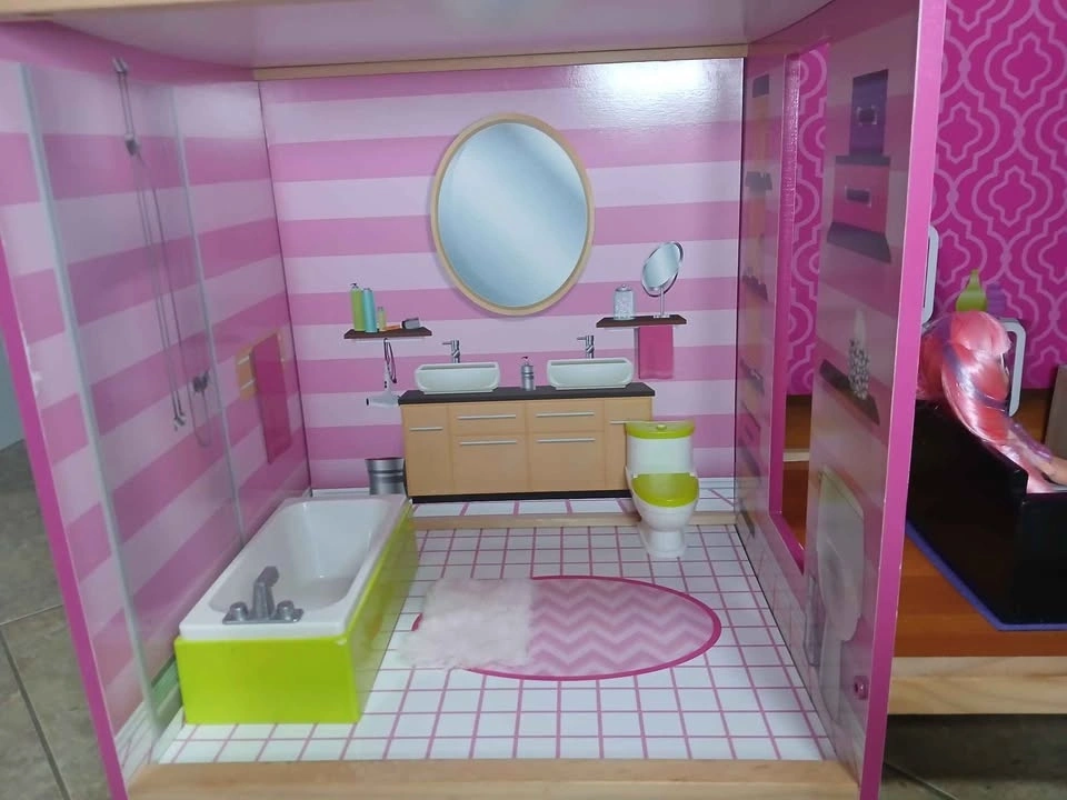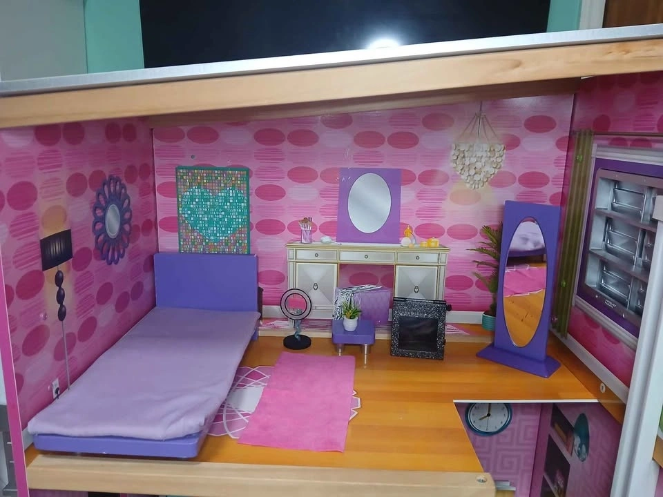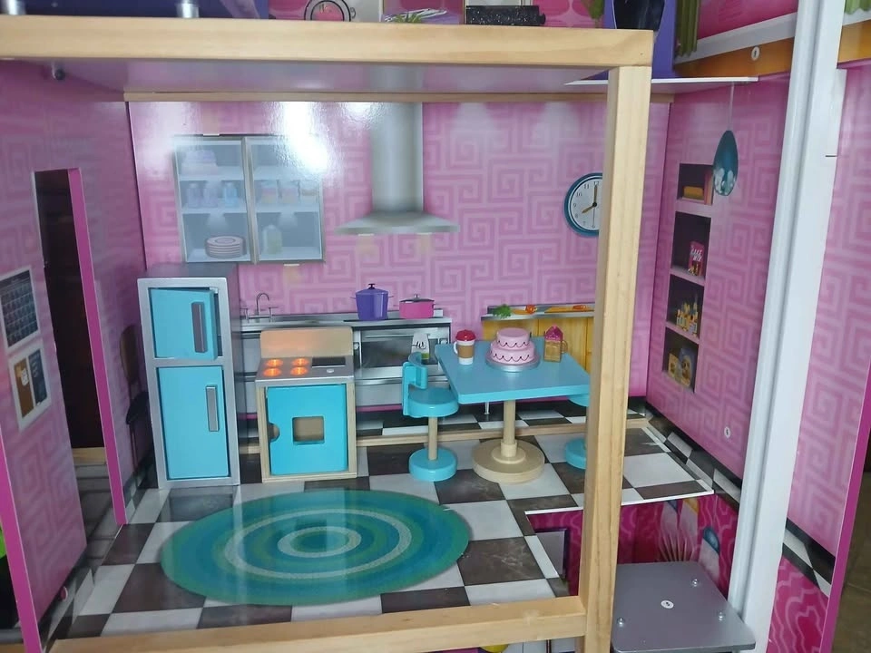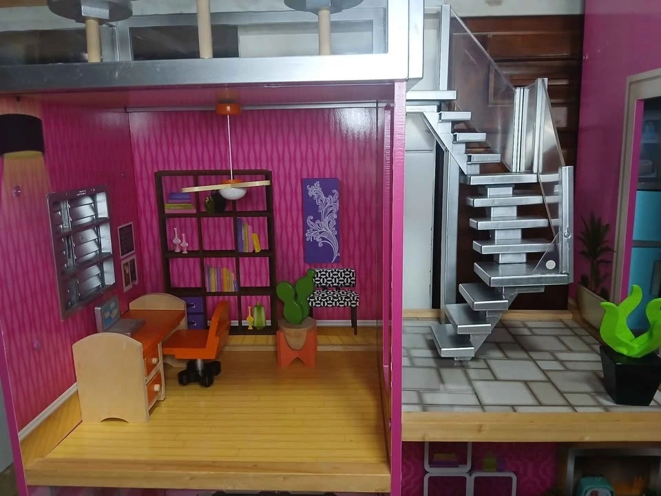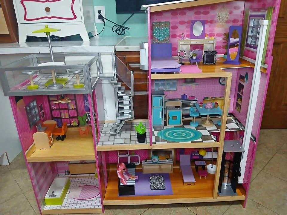 Awesome dollhouse with three levels and lots of rooms. Has a kitchen, bedroom, living room, and bathroom. Comes with furniture, a working elevator, and a cool balcony area.
