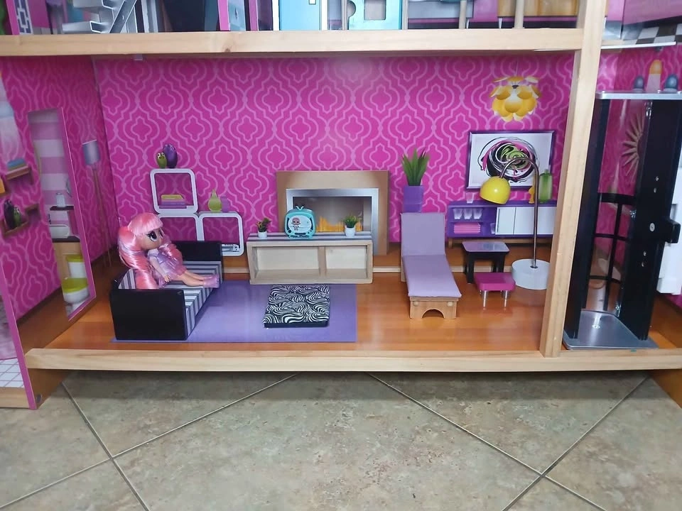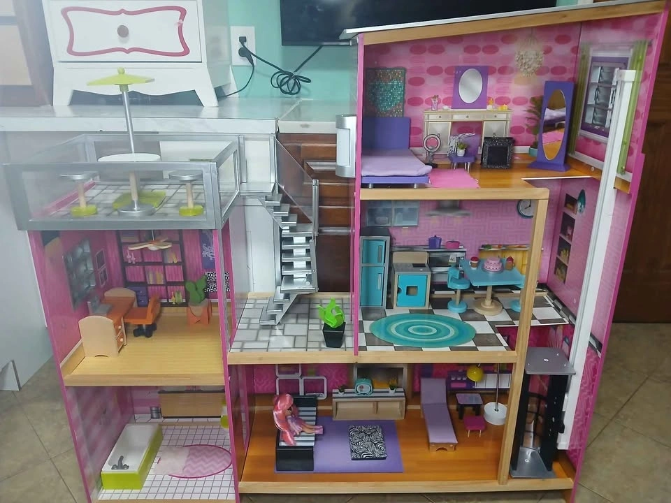 Awesome dollhouse with three levels and lots of rooms. Has a kitchen, bedroom, living room, and bathroom. Comes with furniture, a working elevator, and a cool balcony area.