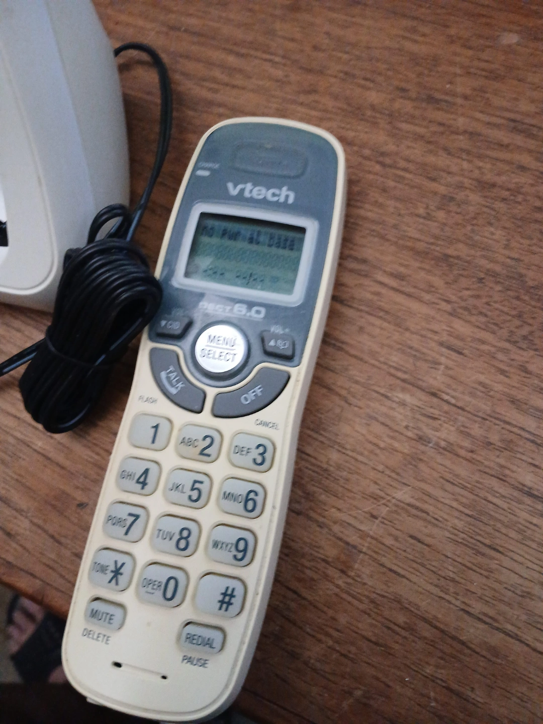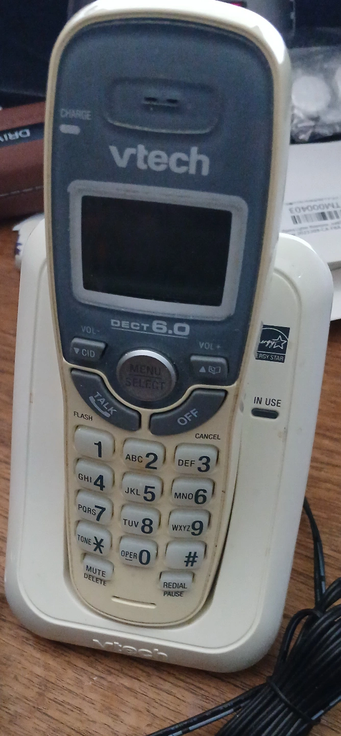 Pre-owned VTech cordless phone. DECT 6.0 technology. Includes base and handset. Standard buttons and features. Good working order.