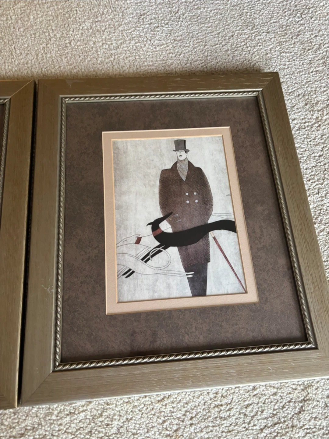 These framed art prints feature stylish men in vintage attire with dogs. They're matted and framed in a brushed gold-tone. A great addition to any home decor!