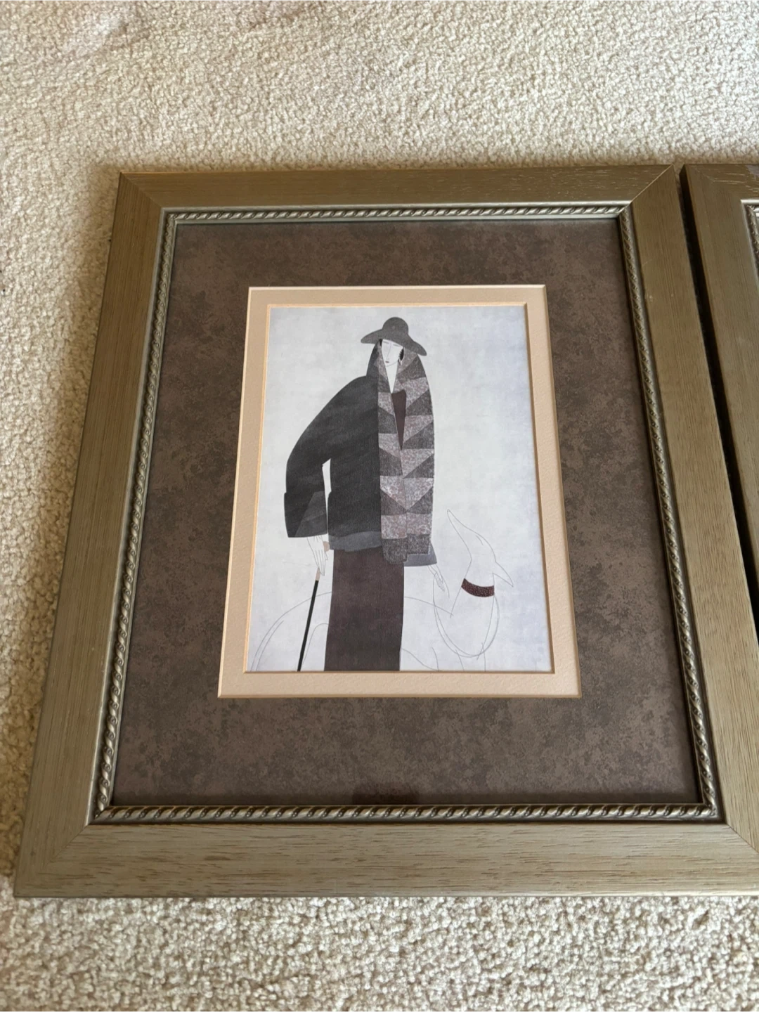 These framed art prints feature stylish men in vintage attire with dogs. They're matted and framed in a brushed gold-tone. A great addition to any home decor!