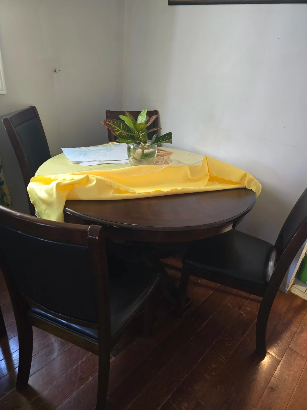 A round wooden dining table with four dark upholstered chairs. The table has a rich wood finish and a pedestal base. It's ideal for smaller dining spaces.
