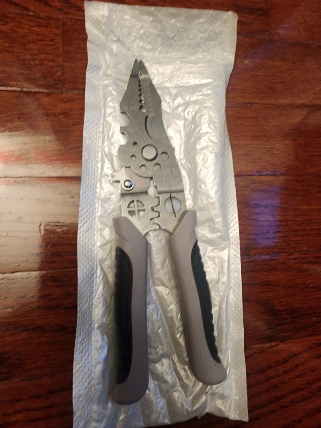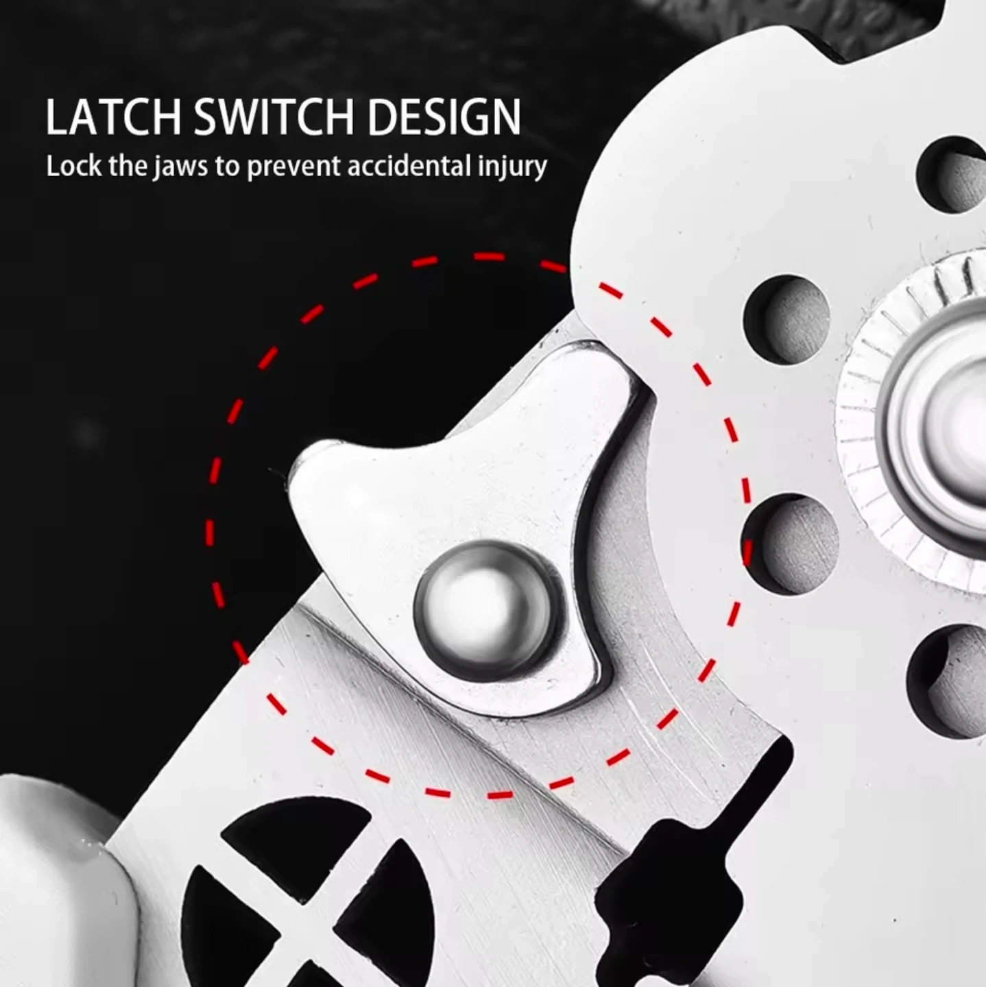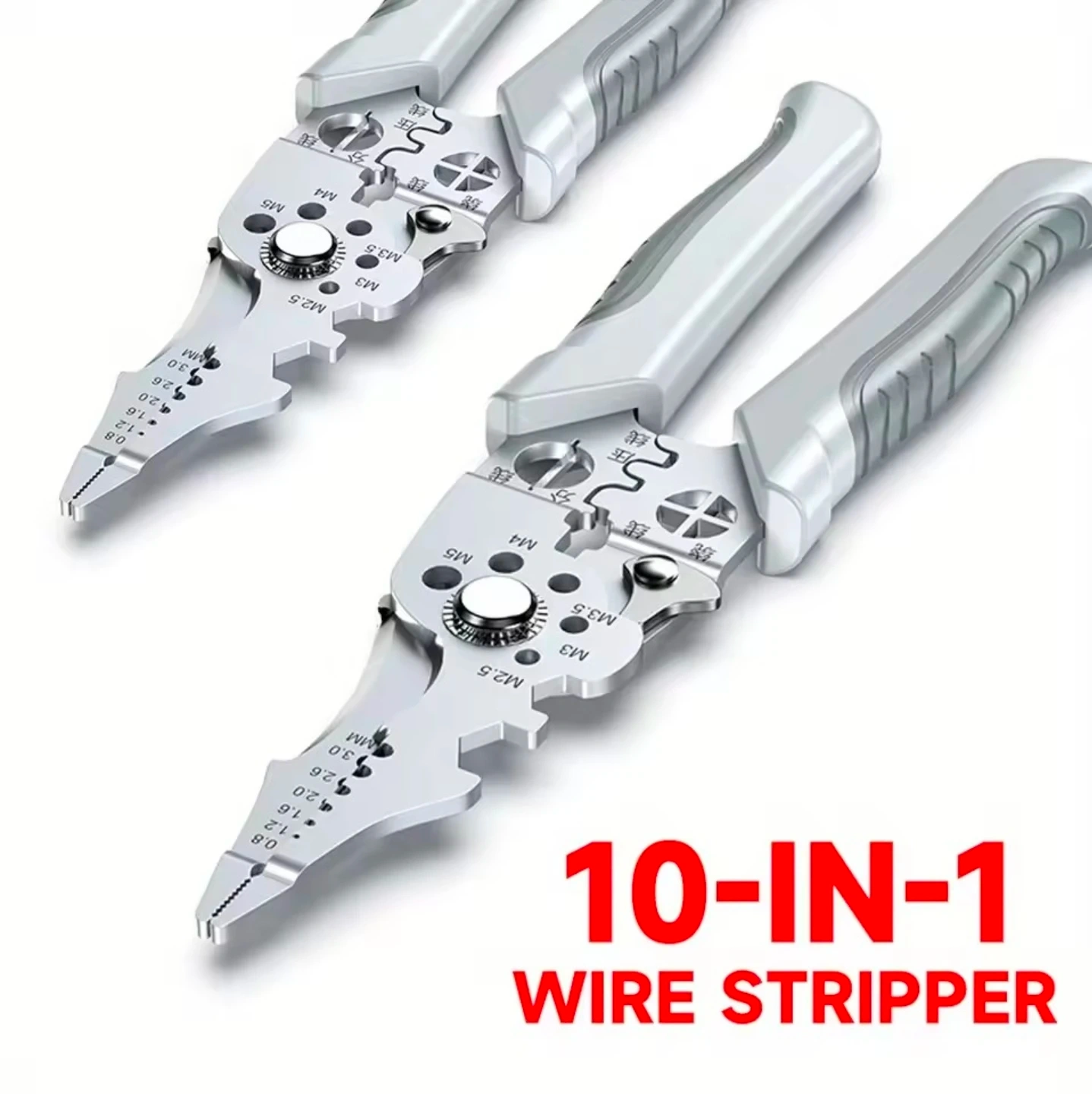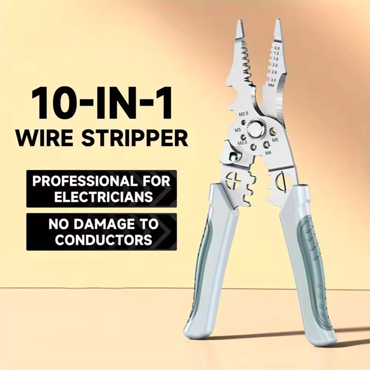 This is a 10-in-1 wire stripper tool designed for electricians. It features a latch switch to lock the jaws for safety. Wire stripping sizes include 0.8, 1.0, 1.3, 1.6, 2.0, 2.6, and 3.0 MM, as well as M3, M3.5, M4, and M5 metric bolt cutters.