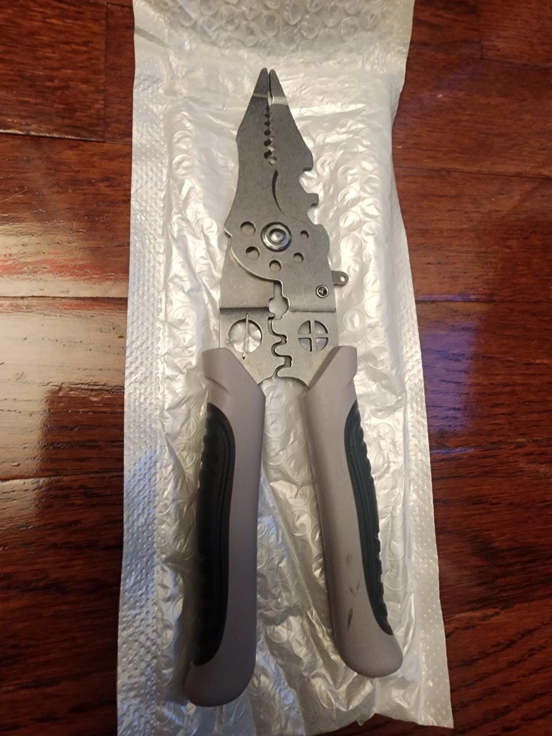 This is a 10-in-1 wire stripper tool designed for electricians. It features a latch switch to lock the jaws for safety. Wire stripping sizes include 0.8, 1.0, 1.3, 1.6, 2.0, 2.6, and 3.0 MM, as well as M3, M3.5, M4, and M5 metric bolt cutters.