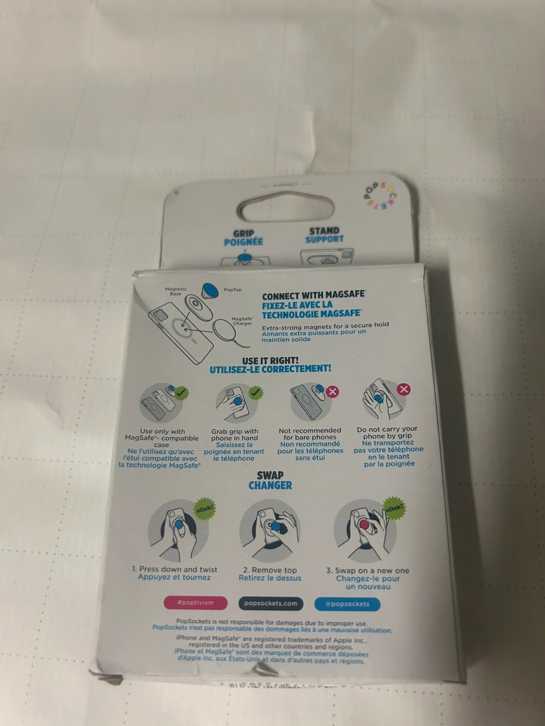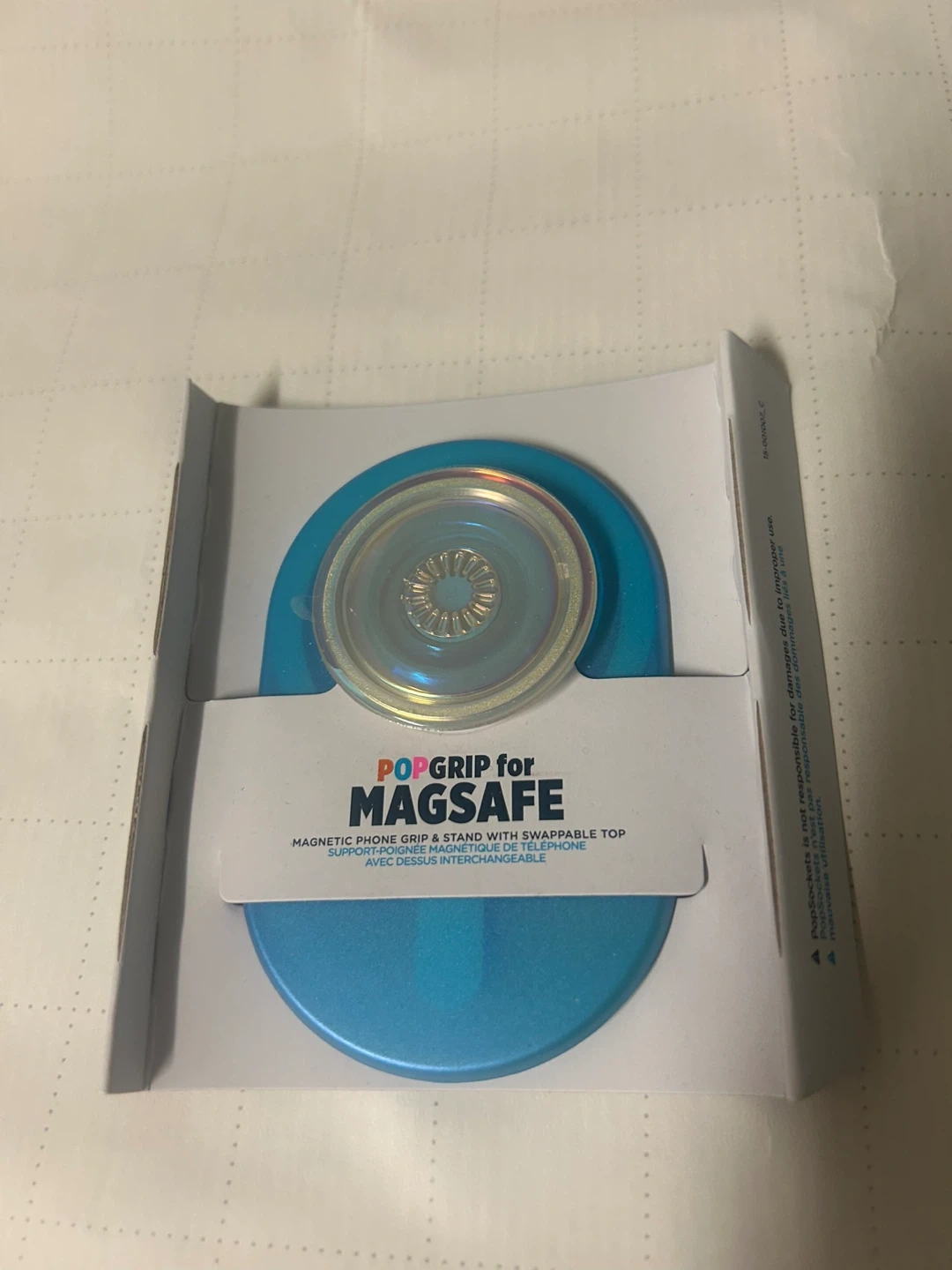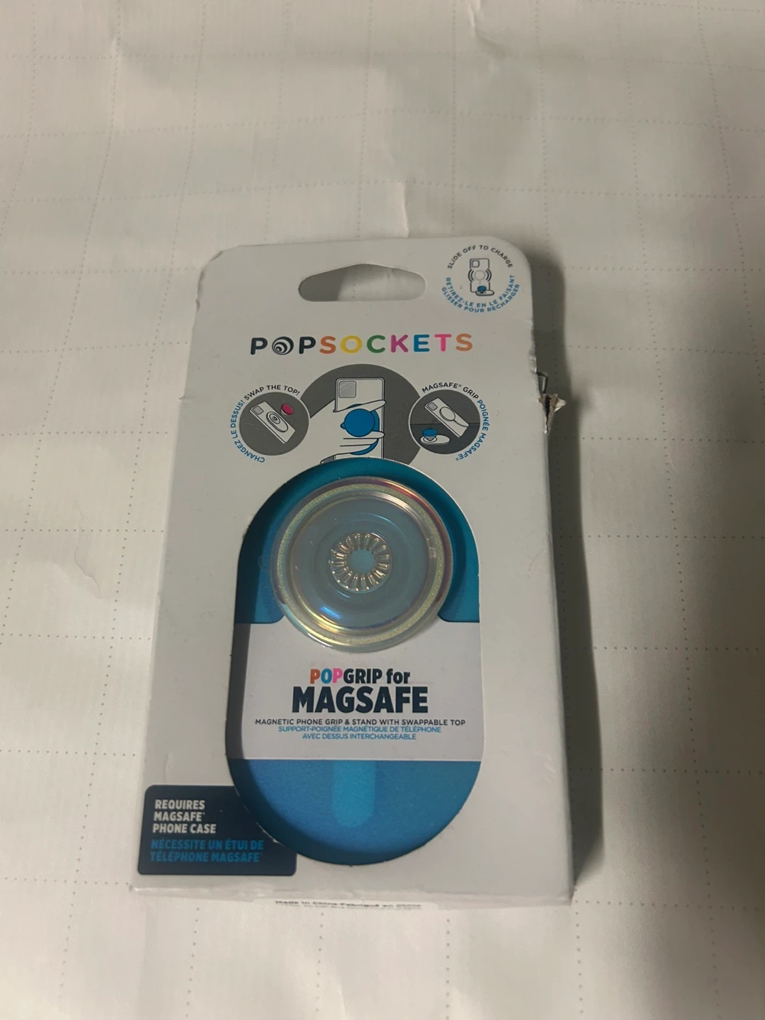 This is a PopSockets Popgrip designed for MagSafe compatible iPhones. It's a magnetic phone grip and stand with a swappable top. Requires a MagSafe phone case for use. Colours available blue, black and white as well.