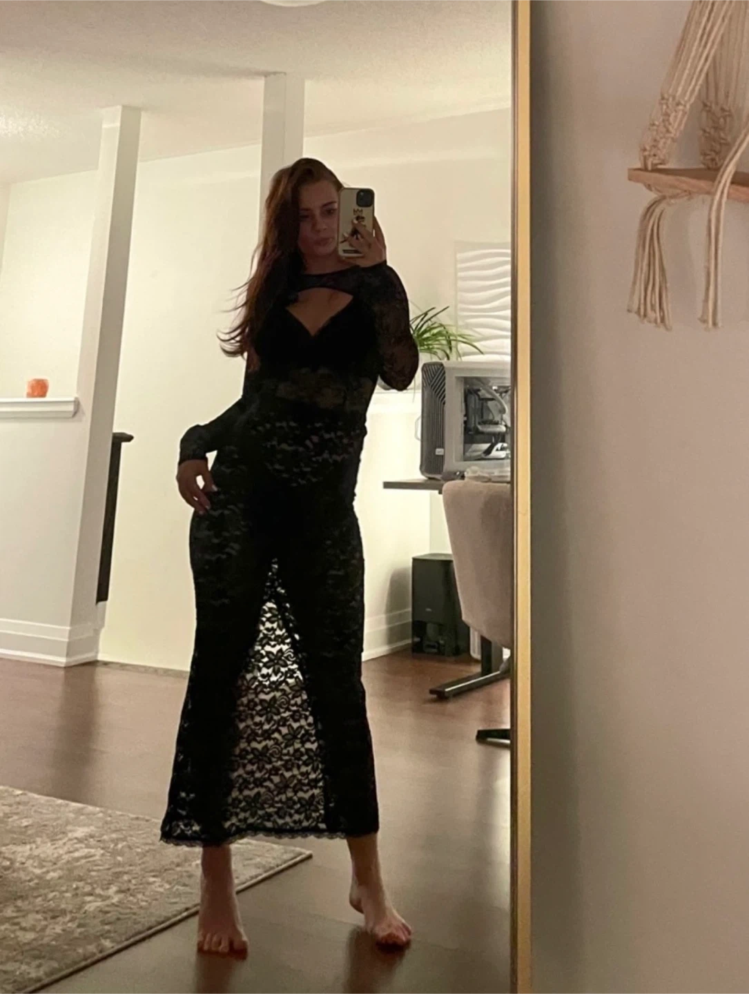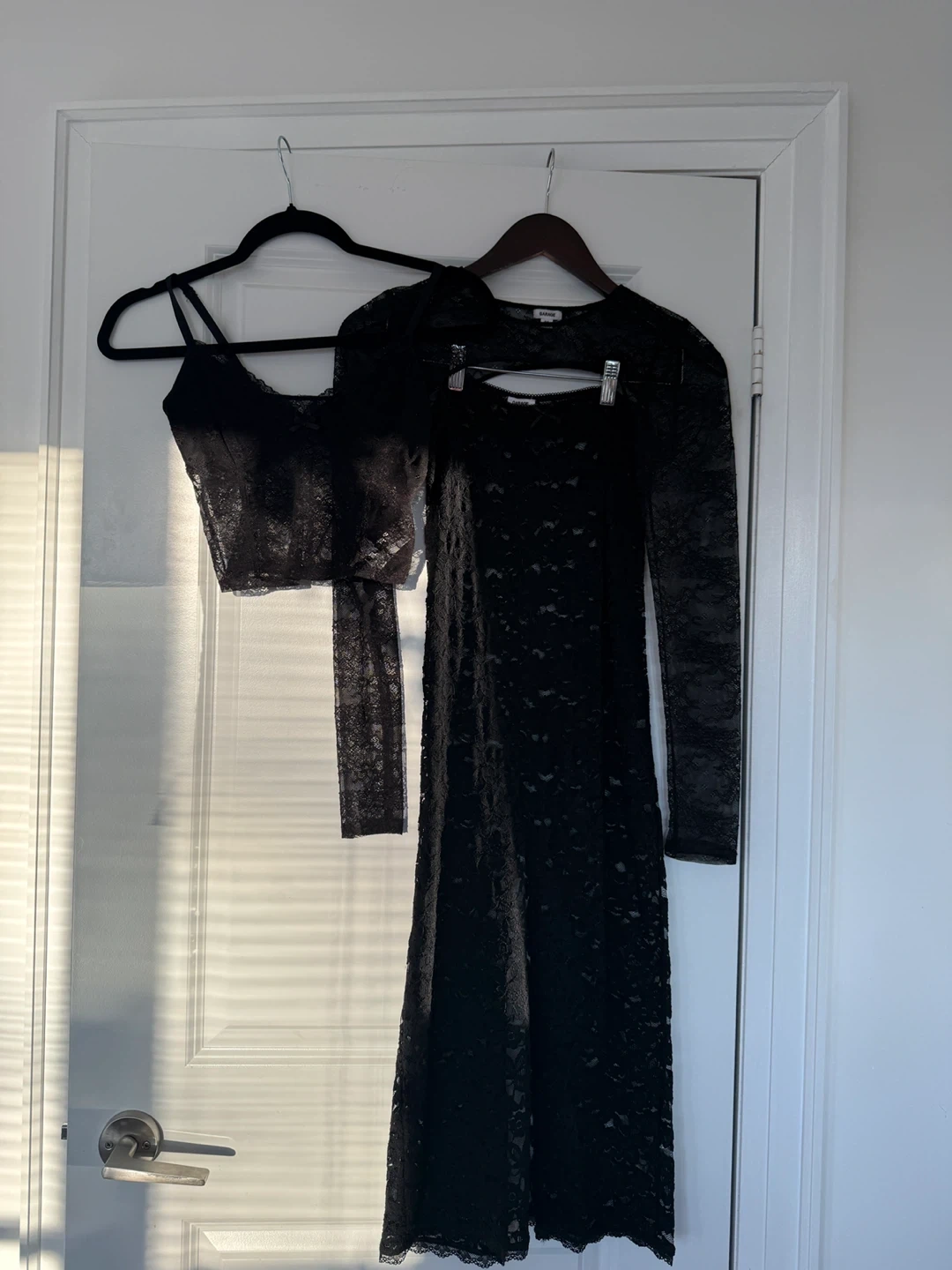 Black lace crop top + matching skirt + sleeves set. Everything is made of delicate lace material. Gorgeous & sexy💗