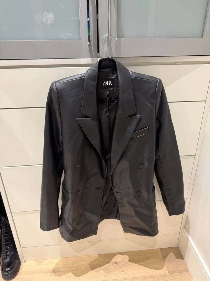 Worn once and in excellent condition! Just needs to be steamed as it has been sitting in my closet. Absolutely no damage whatsoever. Structured double-breasted silhouette in faux leather. Notch lapels and flap pockets. Smooth matte finish for a polished look. Easy to style for day or night. Brand: Zara Colour: Black Size: XS Originally $109 + tax Pick up in North Delta (Sunshine hills area near Krispy Kreme). Can meet at Richmond Centre or Metrotown for $50+ in purchases.
