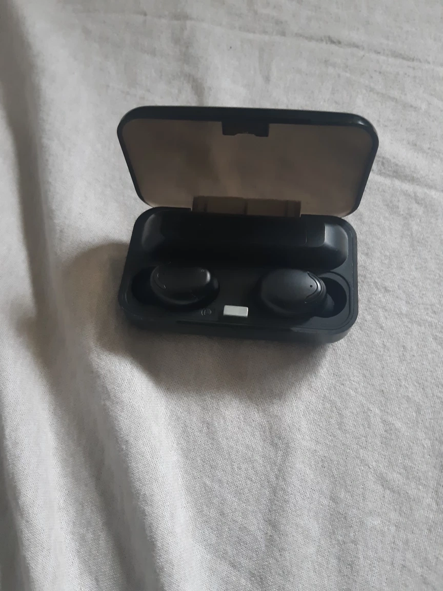 Selling a pair of black wireless earbuds. They come with a charging case so you can keep them powered up on the go. Great for listening to music or podcasts!