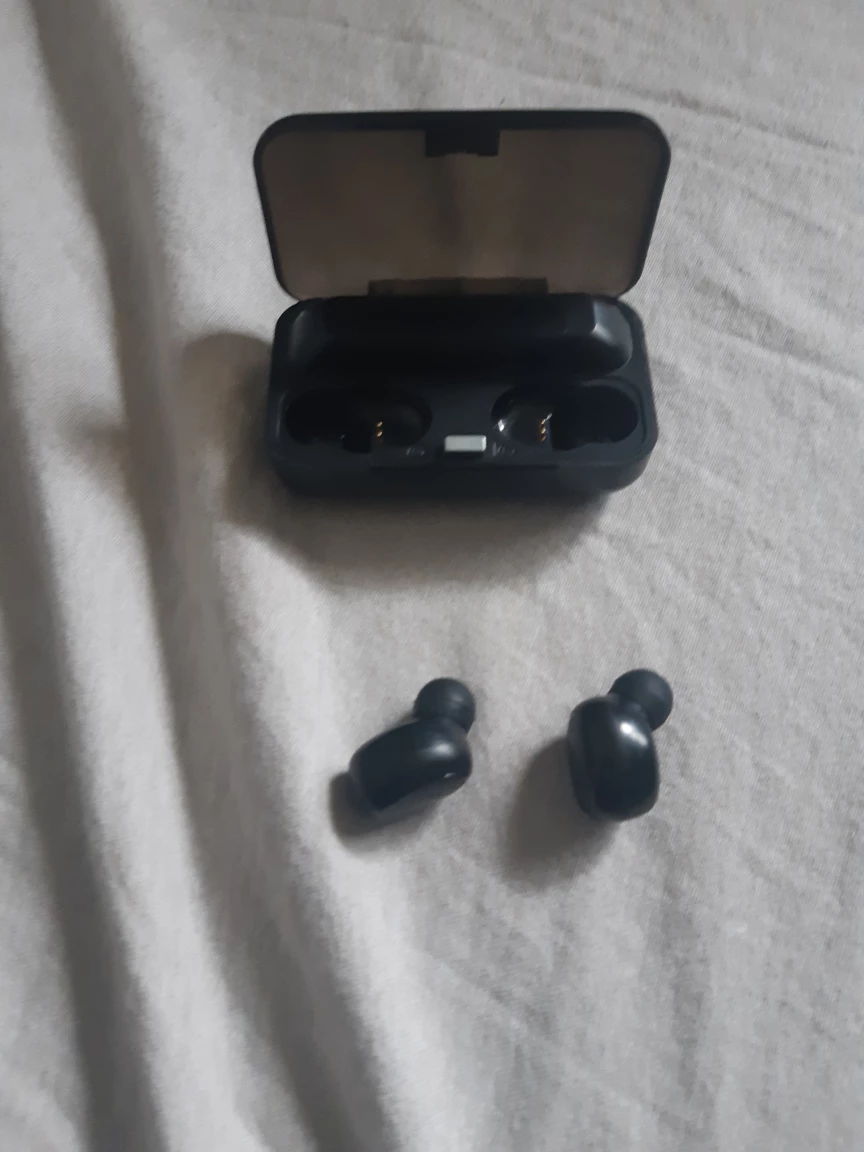 Selling a pair of black wireless earbuds. They come with a charging case so you can keep them powered up on the go. Great for listening to music or podcasts!