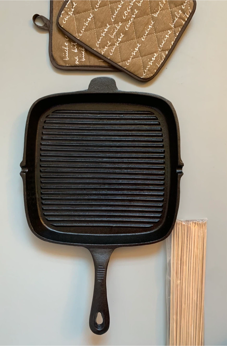 •Goodcook Pre Seasoned Cast Iron Grill Pan with a set of new pot holders and pack of 60 skewers.