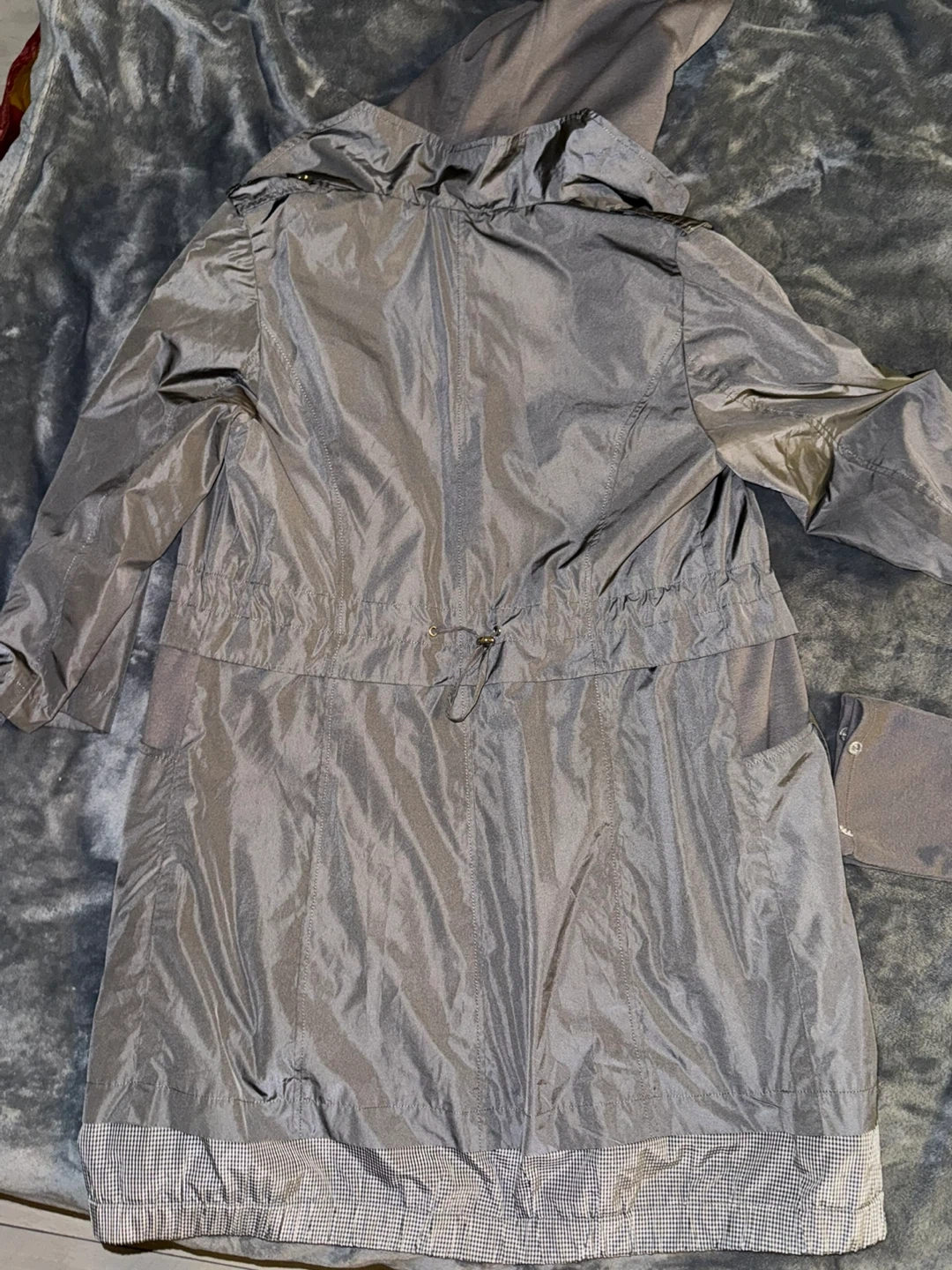 Here's a stylish trench coat from Loss Bini! It's a size 44 and features a unique design with a hood and button details