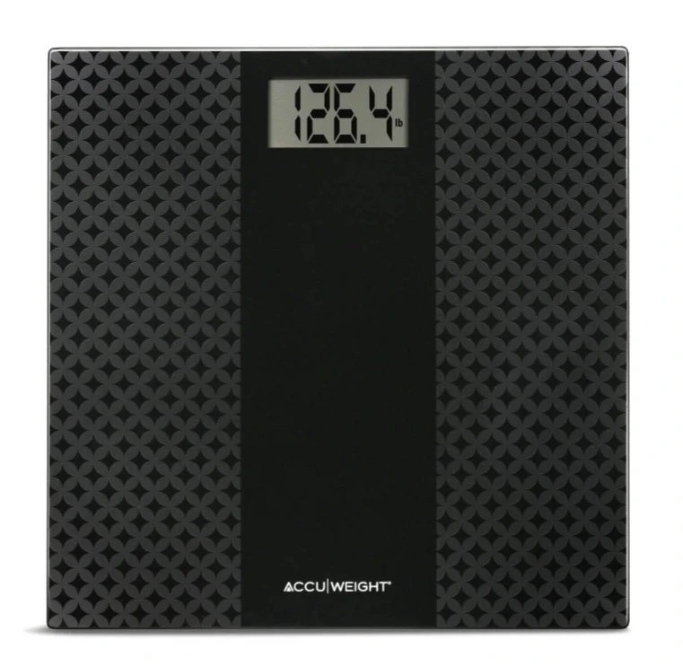 Accuweight digital bathroom scale. Glass platform, step on activation, large display that displays weight in pounds or kg. It's black with a grey geometric pattern.