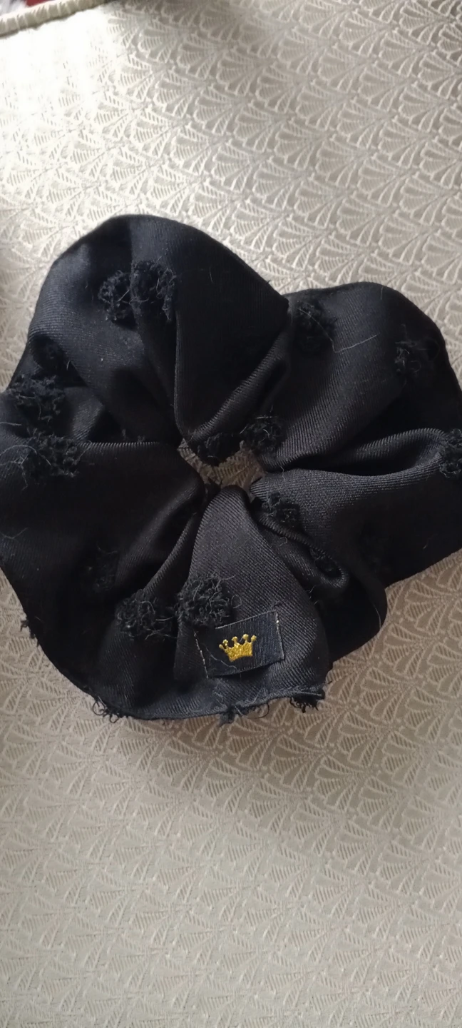 This is a black scrunchie featuring a distressed texture with frayed details. It's adorned with a small gold-tone charm resembling the iconic CC logo. A small tag with a gold crown emblem is also attached.