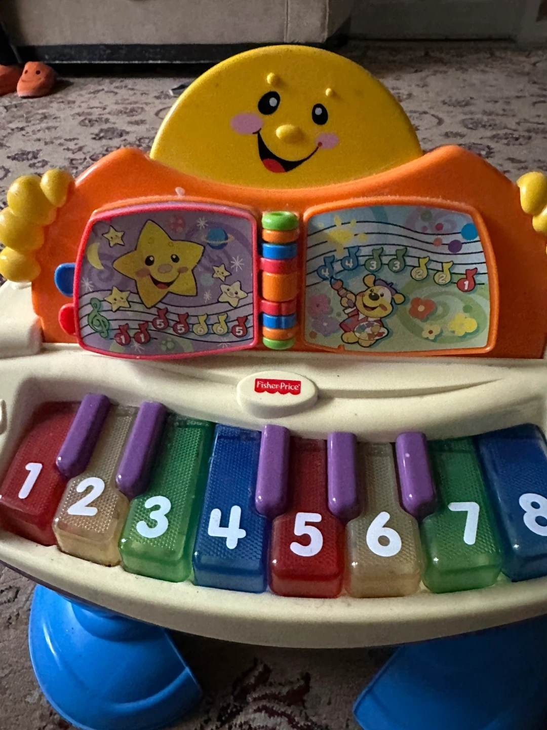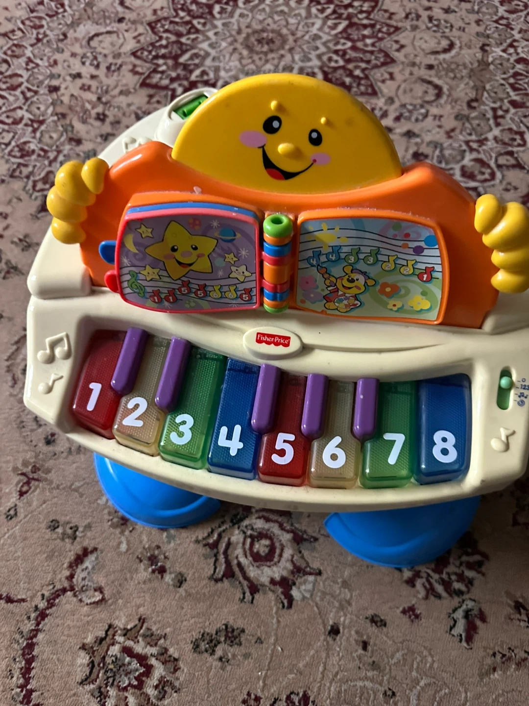Fisher-Price Laugh & Learn baby grand piano. It has colourful keys with numbers and fun graphics. This toy encourages early musical learning and motor skills development. Suitable for infants and toddlers.